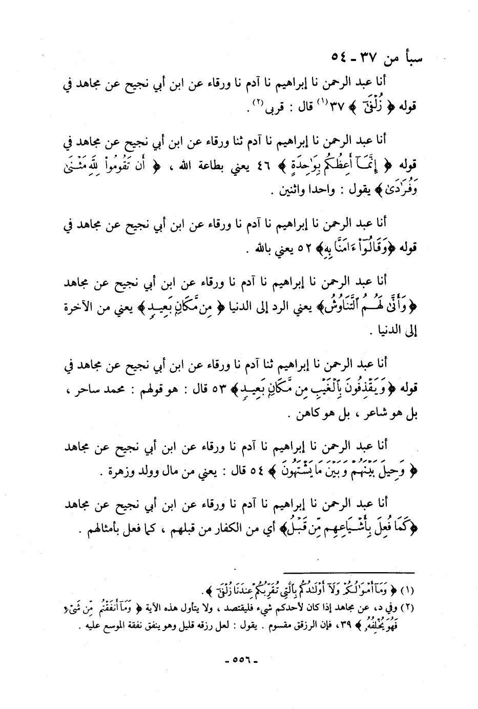 أنا عَبْدُ الرَّحْمَنِ، نا إِبْرَاهِيمُ، نا آدَمُ، نا وَرْقَاءُ، عَنِ ابْنِ أَبِي نَجِيحٍ، عَنْ مُجَاهِدٍ، فِي قَوْلِهِ: {§زُلْفَى} [سبأ: 37] قَالَ: «قُرْبَى»
