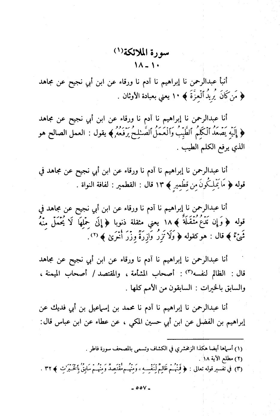 أنا عَبْدُ الرَّحْمَنِ، نا إِبْرَاهِيمُ، نا آدَمُ، نا وَرْقَاءُ، عَنِ ابْنِ أَبِي نَجِيحٍ، عَنْ مُجَاهِدٍ: {إِلَيْهِ يَصْعَدُ الْكَلِمُ الطِّيبُ وَالْعَمَلُ الصَّالِحُ يَرْفَعُهُ} [فاطر: 10] يَقُولُ: «§الْعَمَلُ الصَّالِحُ هُوَ الَّذِي يَرْفَعُ الْكَلِمَ الطِّيبَ»