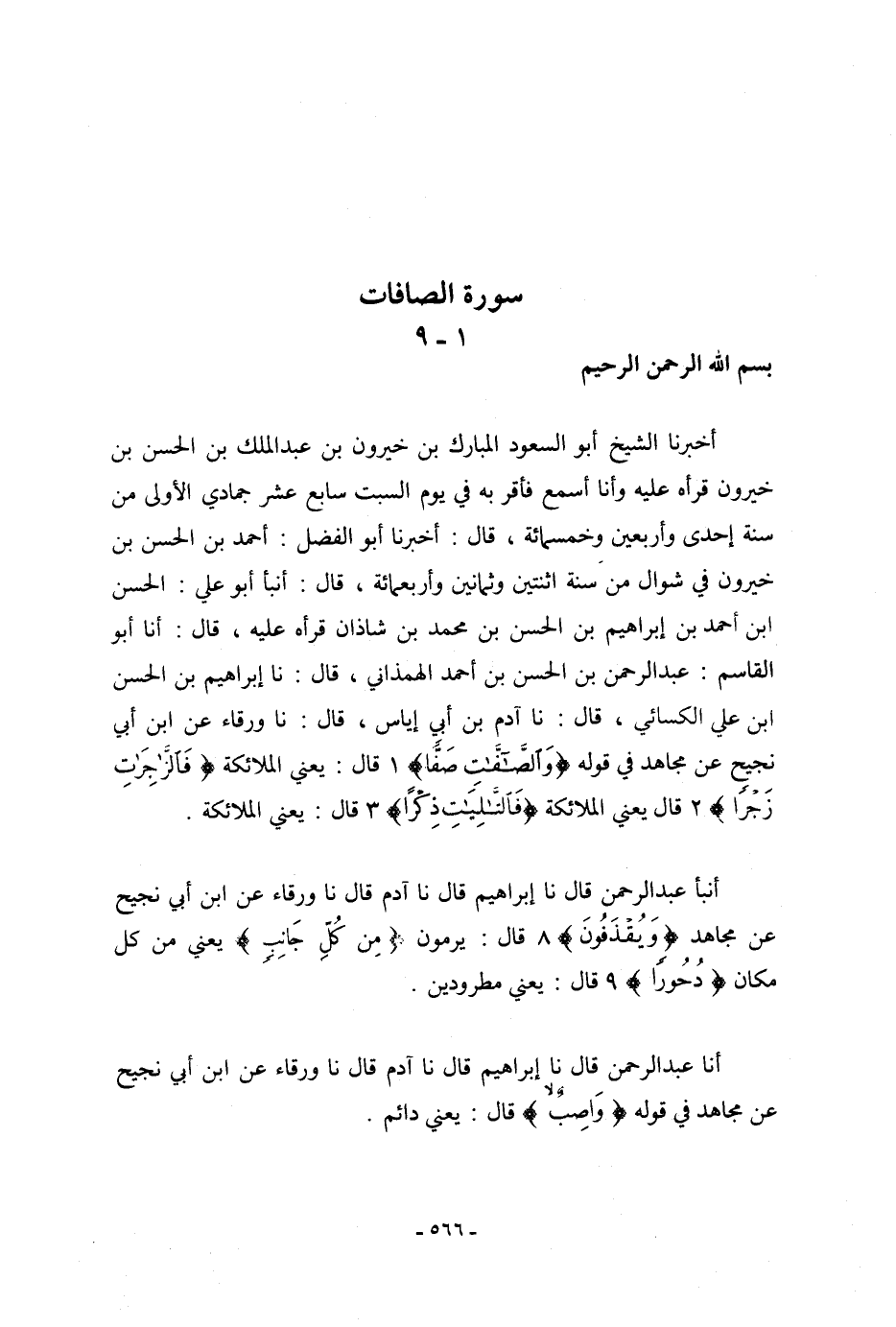 أَخْبَرَنَا الشَّيْخُ أَبُو السُّعُودِ الْمُبَارَكُ بْنُ خَيْرُونَ بْنِ عَبْدِ الْمَلِكِ بْنِ الْحَسَنِ بْنِ خَيْرُونَ، قِرَاءَةً عَلَيْهِ وَأَنَا أَسْمَعُ، فَأَقَرَّ بِهِ فِي يَوْمِ السَّبْتِ سَابِعِ عَشَرَ جُمَادَى الْأُولَى مِنْ سَنَةِ إِحْدِى وَأَرْبَعِينَ وَخَمْسِمِائَةٍ، قَالَ أَخْبَرَنَا أَبُو الْفَضْلِ أَحْمَدُ بْنُ الْحَسَنِ بْنِ خَيْرُونَ فِي شَوَّالٍ مِنْ سَنَةِ اثْنَتَيْنِ وَثَمَانِينَ وَأَرْبَعِمِائَةٍ، قَالَ: أَنبأَ أَبُو عَلِيٍّ الْحَسَنُ بْنُ أَحْمَدَ بْنِ إِبْرَاهِيمَ بْنِ الْحَسَنِ بْنِ مُحَمَّدِ بْنِ شَاذَانَ، قِرَاءَةً عَلَيْهِ، قَالَ: أنا أَبُو الْقَاسِمِ عَبْدُ الرَّحْمَنِ بْنُ الْحَسَنِ بْنِ أَحْمَدَ الْهَمَذَانِيُّ قال نا إِبْرَاهِيمُ بْنُ الْحَسَنِ بْنِ عَلِيٍّ الْكِسَائِيُّ، قَالَ: نا آدَمُ بْنُ أَبِي إِيَاسٍ، قَالَ: نا وَرْقَاءُ، عَنِ ابْنِ أَبِي نَجِيحٍ، عَنْ مُجَاهِدٍ فِي قَوْلِهِ: {§وَالصَّافَّاتِ صَفًّا} [الصافات: 1] قَالَ: «يَعْنِي الْمَلَائِكَةَ» ، {فَالزَّاجِرَاتِ زَجْرًا} [الصافات: 2] قَالَ: «يَعْنِي الْمَلَائِكَةَ» ، {فَالتَّالِيَاتِ ذِكْرًا} [الصافات: 3] قَالَ: «يَعْنِي الْمَلَائِكَةَ»