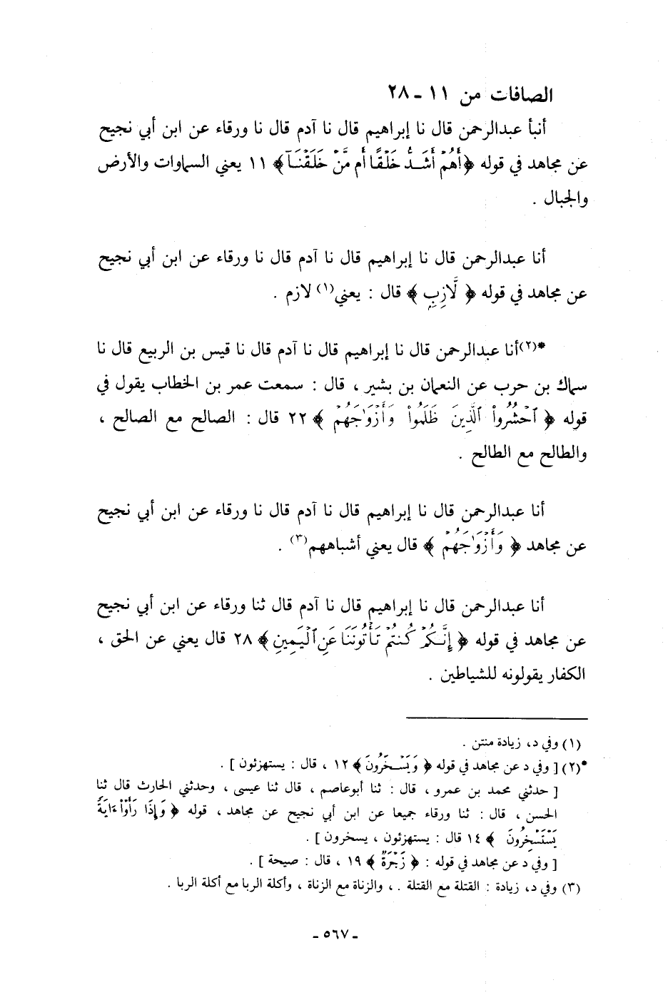 أنا عَبْدُ الرَّحْمَنِ، قَالَ: نا إِبْرَاهِيمُ، قَالَ: نا آدَمُ، قَالَ: نا وَرْقَاءُ، عَنِ ابْنِ أَبِي نَجِيحٍ، عَنْ مُجَاهِدٍ، فِي قَوْلِهِ: {§لَازِبٍ} [الصافات: 11] قَالَ: «يَعْنِي لَازِمٍ»