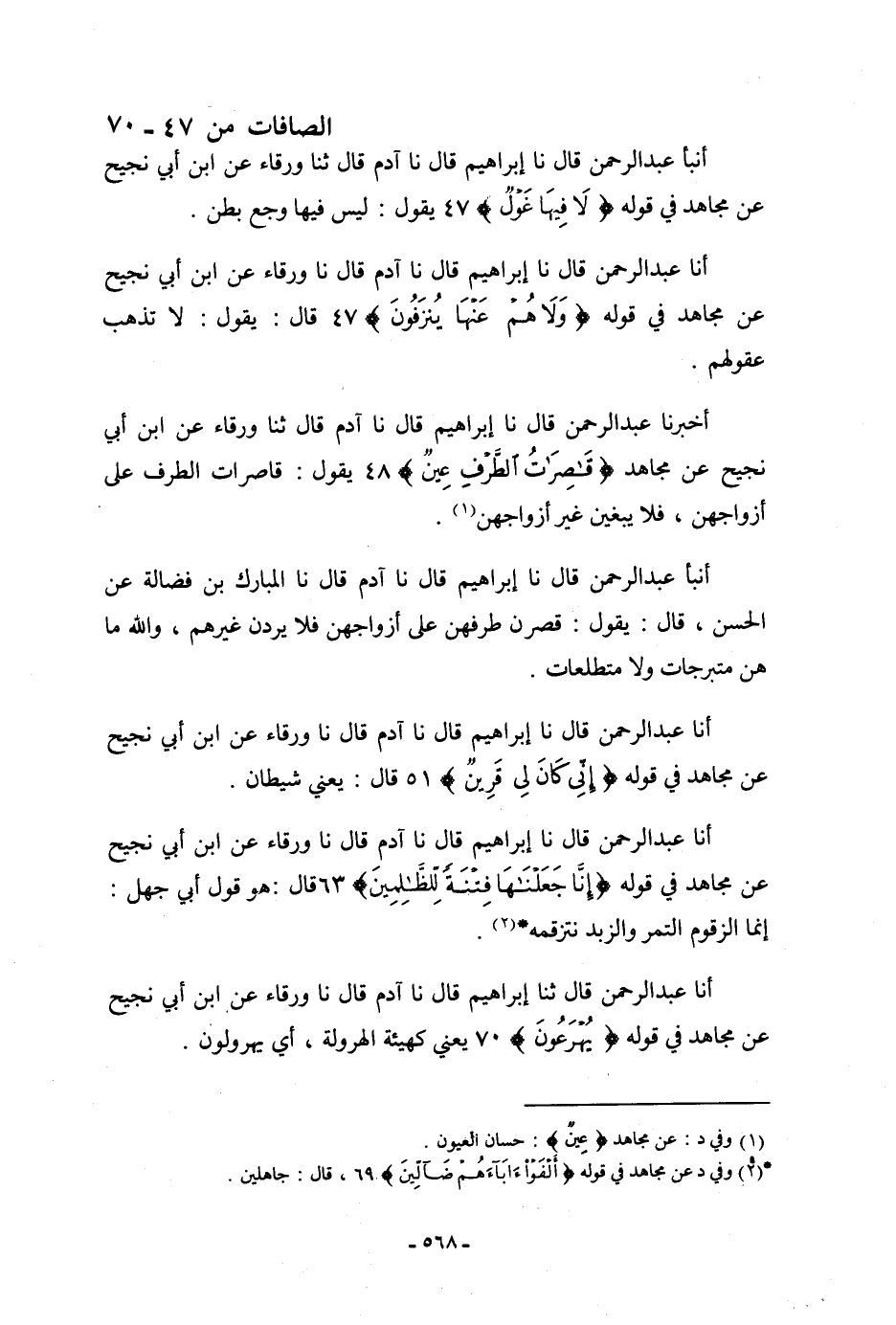 أَخْبَرَنَا عَبْدُ الرَّحْمَنِ، قَالَ: نا إِبْرَاهِيمُ، قَالَ: نا آدَمُ، قَالَ: ثنا وَرْقَاءُ، عَنِ ابْنِ أَبِي نَجِيحٍ، عَنْ مُجَاهِدٍ: {قَاصِرَاتٌ الطَّرْفِ عِينٌ} [الصافات: 48] يَقُولُ: «§قَاصِرَاتُ الطَّرْفِ عَلَى أَزْوَاجِهِنَّ، فَلَا يَبْغِينَ غَيْرَ أَزْوَاجِهِنَّ»