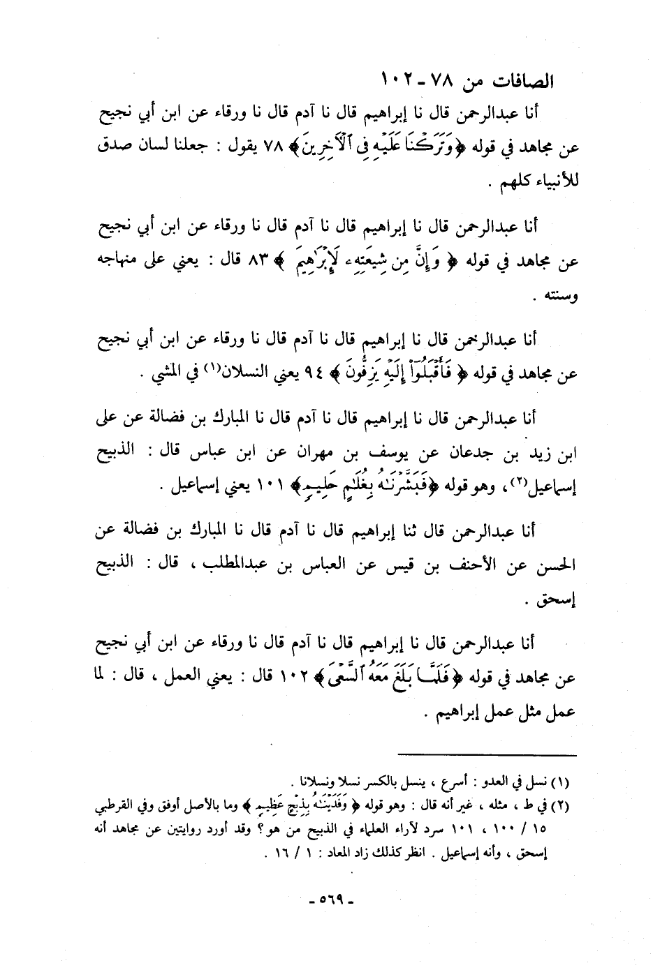 أنا عَبْدُ الرَّحْمَنِ، قَالَ: نا إِبْرَاهِيمُ، قَالَ: نا آدَمُ، قَالَ: نا وَرْقَاءُ، عَنِ ابْنِ أَبِي نَجِيحٍ، عَنْ مُجَاهِدٍ، فِي قَوْلِهِ: {فَلَمَّا بَلَغَ مَعَهُ السَّعْيَ} [الصافات: 102] قَالَ: «يَعْنِي الْعَمَلَ،» قَالَ: «§لَمَّا عَمِلَ مِثْلَ عَمَلِ إِبْرَاهِيمَ»