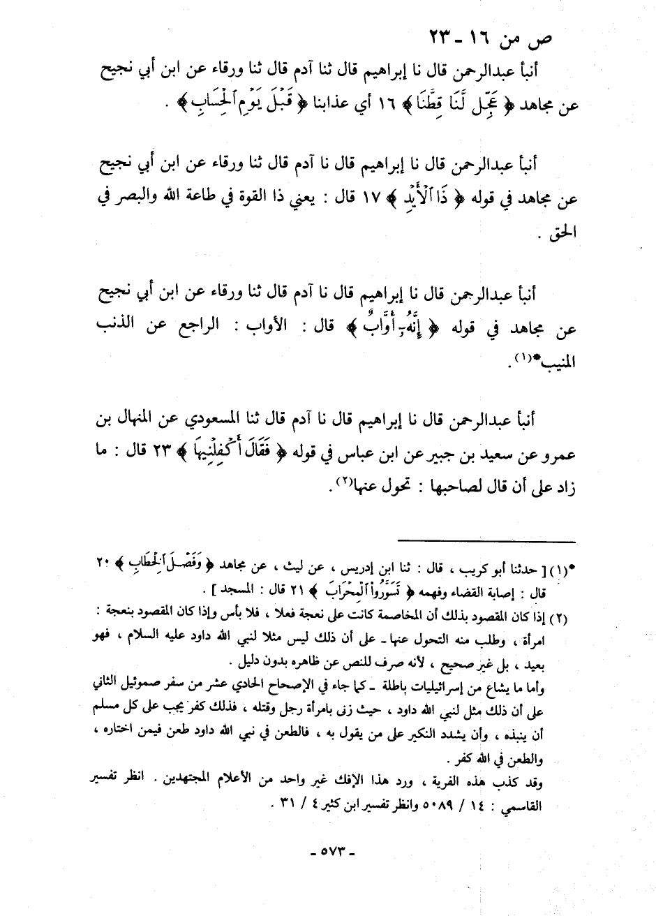 أنبأ عَبْدُ الرَّحْمَنِ، قَالَ: نا إِبْرَاهِيمُ، قَالَ: نا آدَمُ، قَالَ: ثنا وَرْقَاءُ، عَنِ ابْنِ أَبِي نَجِيحٍ، عَنْ مُجَاهِدٍ، فِي قَوْلِهِ: {ذَا الْأَيْدِ} [ص: 17] قَالَ: «يَعْنِي §ذَا الْقُوَّةِ فِي طَاعَةِ اللَّهِ وَالْبَصَرِ فِي الْحَقِّ»