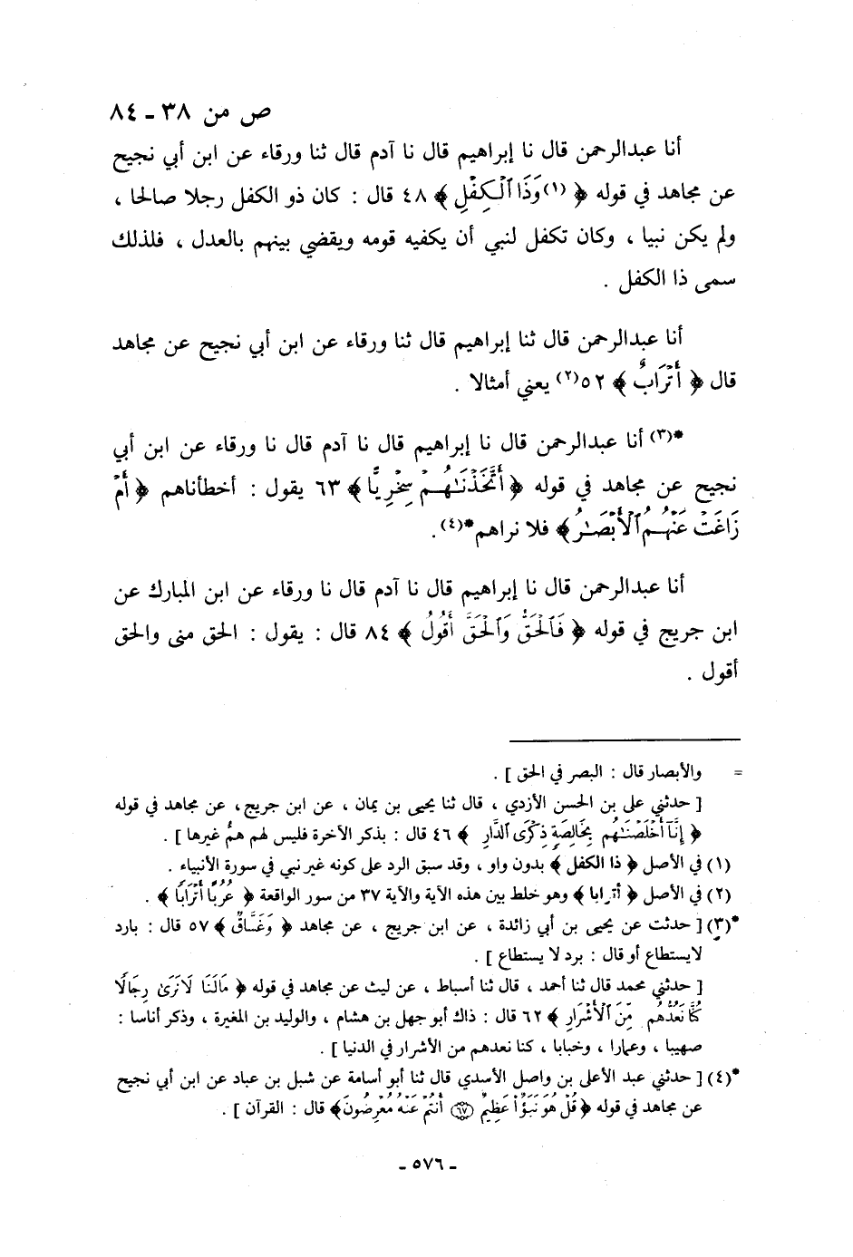 أنا عَبْدُ الرَّحْمَنِ، قَالَ: نا إِبْرَاهِيمُ، قَالَ: نا آدَمُ، قَالَ: ثنا وَرْقَاءُ، عَنِ ابْنِ أَبِي نَجِيحٍ، عَنْ مُجَاهِدٍ، فِي قَوْلِهِ: {§وَذَا الْكِفْلِ} [ص: 48] قَالَ: «كَانَ ذُو الْكِفْلِ رَجُلًا صَالِحًا وَلَمْ يَكُنْ نَبِيًّا، وَكَانَ تَكَفَّلَ لِنَبِيٍّ أَنْ يَكْفِيَهُ قَوْمَهُ وَيَقْضِي بَيْنَهُمْ بِالْعَدْلِ فَلِذَلِكَ سُمِيَّ ذَا الْكِفْلِ»