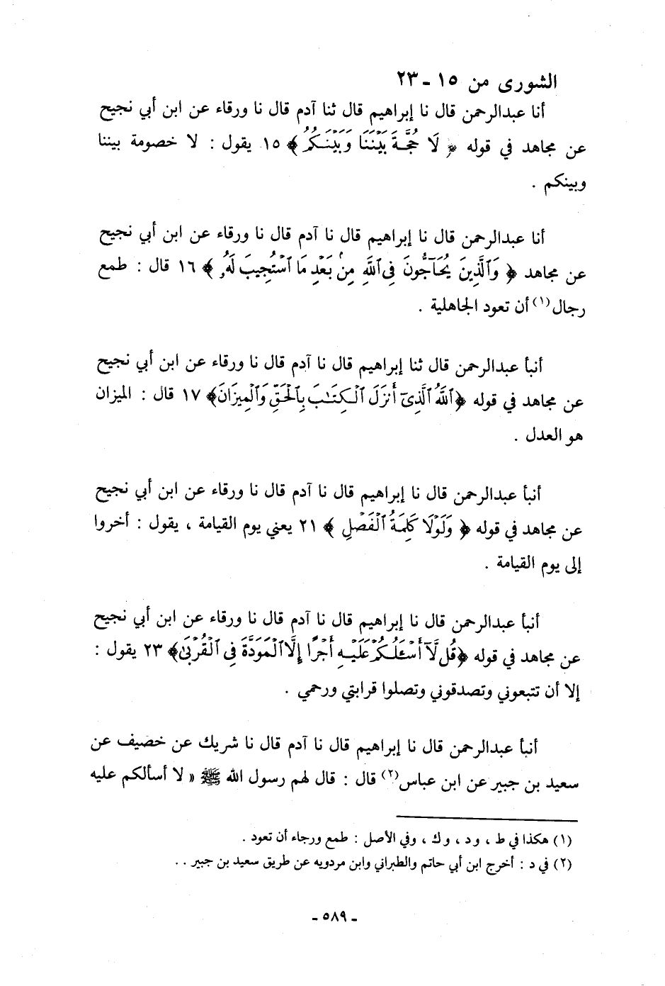 أنا عَبْدُ الرَّحْمَنِ، قَالَ: نا إِبْرَاهِيمُ، قَالَ: ثنا آدَمُ، قَالَ: نا وَرْقَاءُ، عَنِ ابْنِ أَبِي نَجِيحٍ، عَنْ مُجَاهِدٍ، فِي قَوْلِهِ: {لَا حُجَّةَ بَيْنَنَا وَبَيْنَكُمْ} [الشورى: 15] يَقُولُ: «§لَا خُصُومَةَ بَيْنَنَا وَبَيْنَكُمْ»