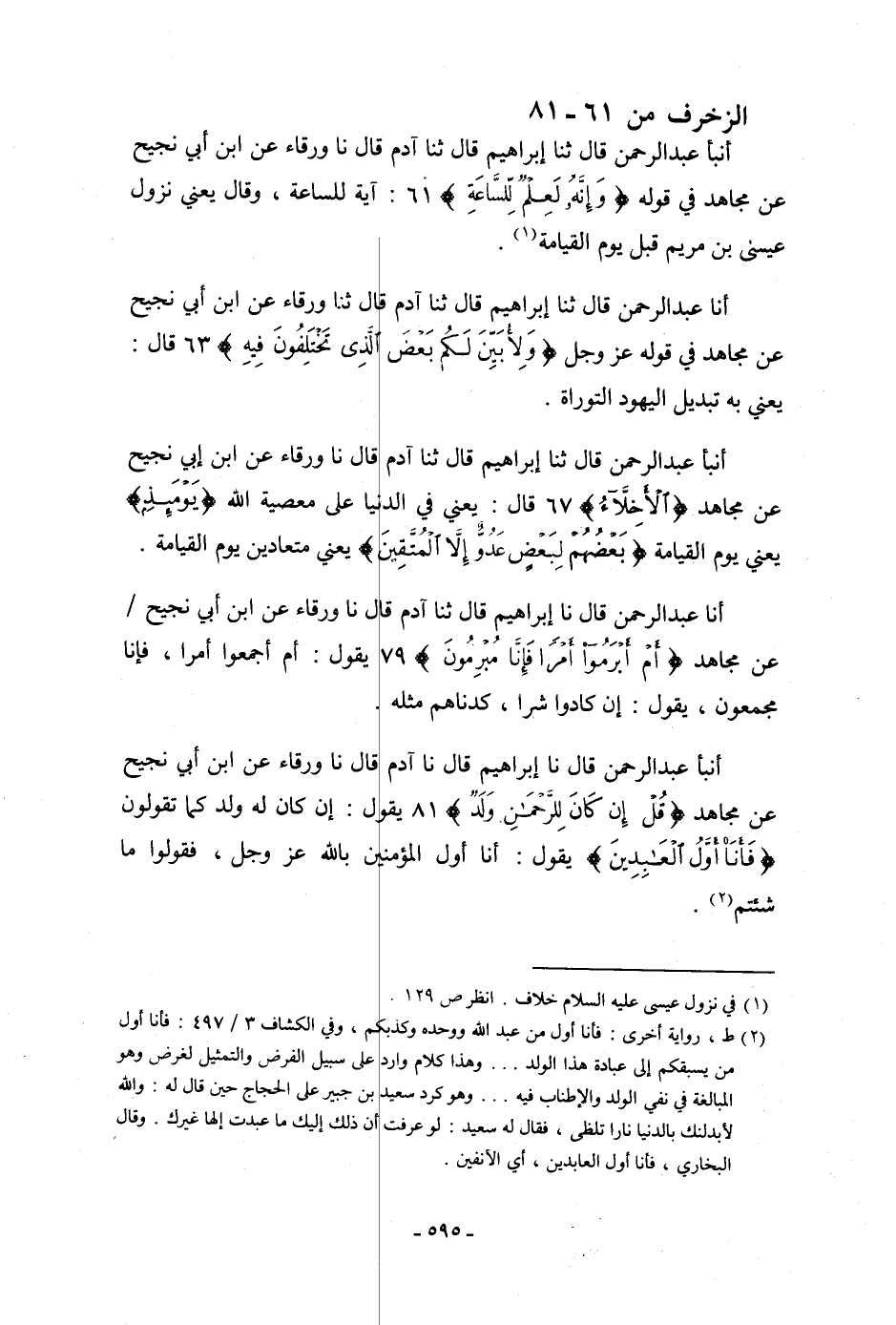 أنبأ عَبْدُ الرَّحْمَنِ، قَالَ: ثنا إِبْرَاهِيمُ، قَالَ: ثنا آدَمُ، قَالَ: نا وَرْقَاءُ، عَنِ ابْنِ أَبِي نَجِيحٍ، عَنْ مُجَاهِدٍ، فِي قَوْلِهِ: {§وَإِنَّهُ لَعِلْمٌ لِلسَّاعَةِ} [الزخرف: 61] «آيَةٌ لِلسَّاعَةِ» ، وَقَالَ: يَعْنِي نُزُولَ عِيسَى ابْنِ مَرْيَمَ قَبْلَ يَوْمِ الْقِيَامَةِ "
