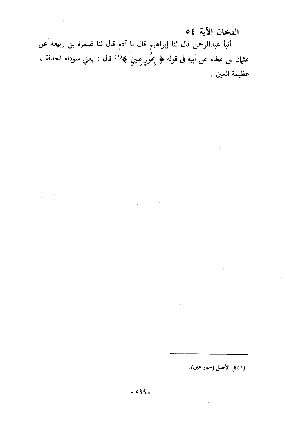 أنبأ عَبْدُ الرَّحْمَنِ، قَالَ: ثنا إِبْرَاهِيمُ، قَالَ: نا آدَمُ، قَالَ: ثنا ضَمْرَةُ بْنُ رَبِيعَةَ، عَنْ عُثْمَانَ بْنِ عَطَاءٍ، عَنْ أَبِيهِ، فِي قَوْلِهِ: {بِحُورٍ عِينٍ} [الدخان: 54] قَالَ: «يَعْنِي §سَوْدَاءَ الْحَدَقَةِ، عَظِيمَةَ الْعَيْنِ»