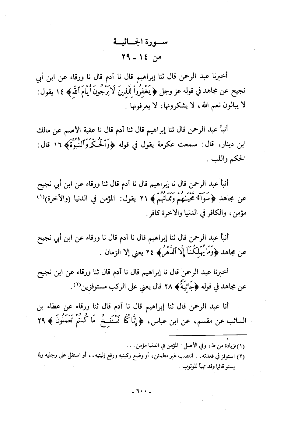 أَخْبَرَنَا عَبْدُ الرَّحْمَنِ، قَالَ: نا إِبْرَاهِيمُ، قَالَ: نا آدَمُ، قَالَ: ثنا وَرْقَاءُ، عَنِ ابْنِ أَبِي نَجِيحٍ، عَنْ مُجَاهِدٍ، فِي قَوْلِهِ: {جَاثِيَةً} [الجاثية: 28] قَالَ: «يَعْنِي §عَلَى الرُّكَبِ مُسْتَوْفِزِينَ»