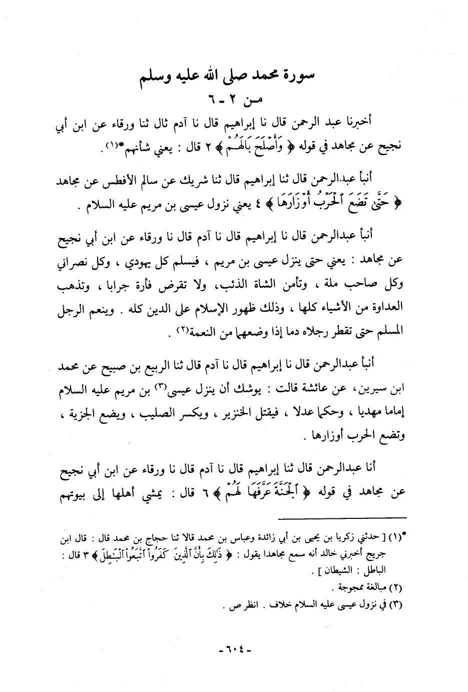 أنبأ عَبْدُ الرَّحْمَنِ، قَالَ: نا إِبْرَاهِيمُ، قَالَ: نا آدَمُ، قَالَ: نا وَرْقَاءُ، عَنِ ابْنِ أَبِي نَجِيحٍ، عَنْ مُجَاهِدٍ يَعْنِي: «§حَتَّى يَنْزِلَ عِيسَى ابْنُ مَرْيَمَ، فَيُسْلِمُ كُلُّ يَهُوَدِيٍّ، وَكُلُّ نَصْرَانِيٍّ، وَكُلُّ صَاحِبِ مِلَّةٍ، وَتَأْمَنُ الشَّاةُ الذِّئْبَ، وَلَا تَقْرِضُ فَأْرَةٌ جِرَابًا، وَتَذْهَبُ الْعَدَاوَةُ مِنَ الْأَشْيَاءِ كُلِّهَا، وَذَلِكَ ظُهُورُ الْإِسْلَامِ عَلَى الدِّينِ كُلِّهِ، وَيَنْعَمُ الرَّجُلُ الْمُسْلِمُ حَتَّى تَقْطُرَ رِجْلَاهُ دَمًا إِذَا وَضَعَهُمَا مِنَ النَّعْمَةِ»