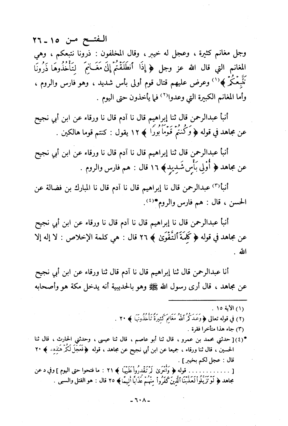 أنبأ عَبْدُ الرَّحْمَنِ، قَالَ: نا إِبْرَاهِيمُ، قَالَ: نا آدَمُ، قَالَ: نا وَرْقَاءُ، عَنِ ابْنِ أَبِي نَجِيحٍ، عَنْ مُجَاهِدٍ، فِي قَوْلِهِ: {كَلِمَةَ التَّقْوَى} [الفتح: 26] قَالَ: «§هِيَ كَلِمَةُ الْإِخْلَاصِ لَا إِلَهَ إِلَّا اللَّهُ»