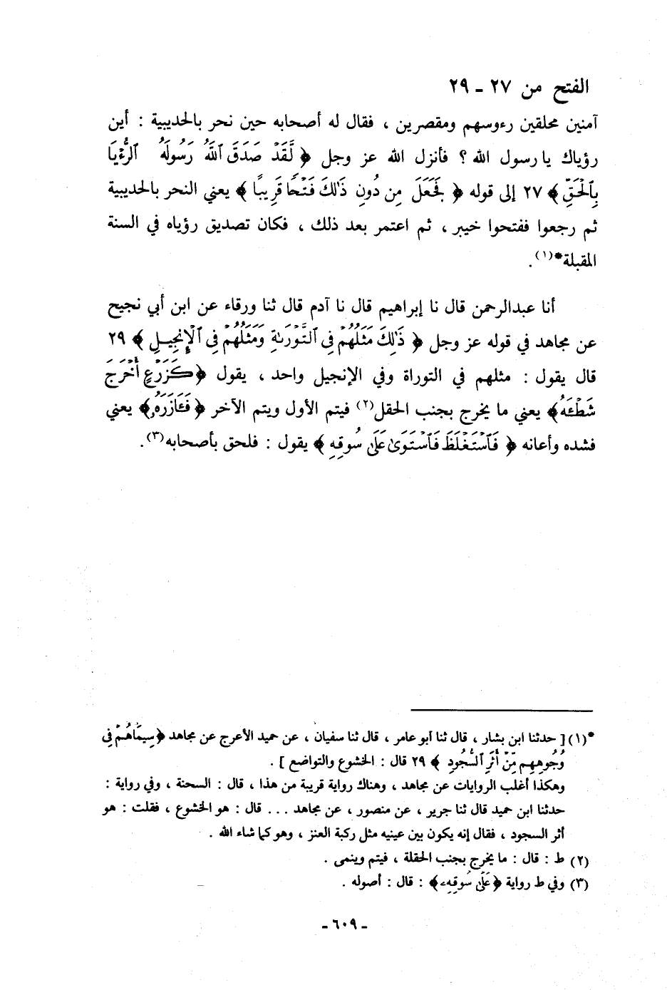 أنا عَبْدُ الرَّحْمَنِ، قَالَ: نا إِبْرَاهِيمُ، قَالَ: نا آدَمُ، قَالَ: ثنا وَرْقَاءُ، عَنِ ابْنِ أَبِي نَجِيحٍ، عَنْ مُجَاهِدٍ، فِي قَوْلِهِ عَزَّ وَجَلَّ: {§ذَلِكَ مَثَلُهُمْ فِي التَّوْرَاةِ وَمَثَلُهُمْ فِي الْإِنْجِيلِ} [الفتح: 29] قَالَ: يَقُولُ مَثَلُهُمْ فِي التَّوْرَاةِ وَفِي الْإِنْجِيلِ وَاحِدٌ، يَقُولُ: {كَزَرْعٍ أَخْرَجَ شَطْأَهُ} [الفتح: 29] "، يَعْنِي: «مَا يَخْرُجُ بِجَنْبِ الْحَقْلِ فَيَتِمُّ الْأَوَّلُ وَيَتِمُّ الْآخَرُ» ، {فَآزَرَهُ} [الفتح: 29] ، يَعْنِي: «فَشَدَّهُ وَأَعَانَهُ» ، {فَاسْتَغْلَظَ فَاسْتَوَى عَلَى سُوقِهِ} [الفتح: 29] يَقُولُ: «فَلَحِقَ بِأَصْحَابِهِ»
