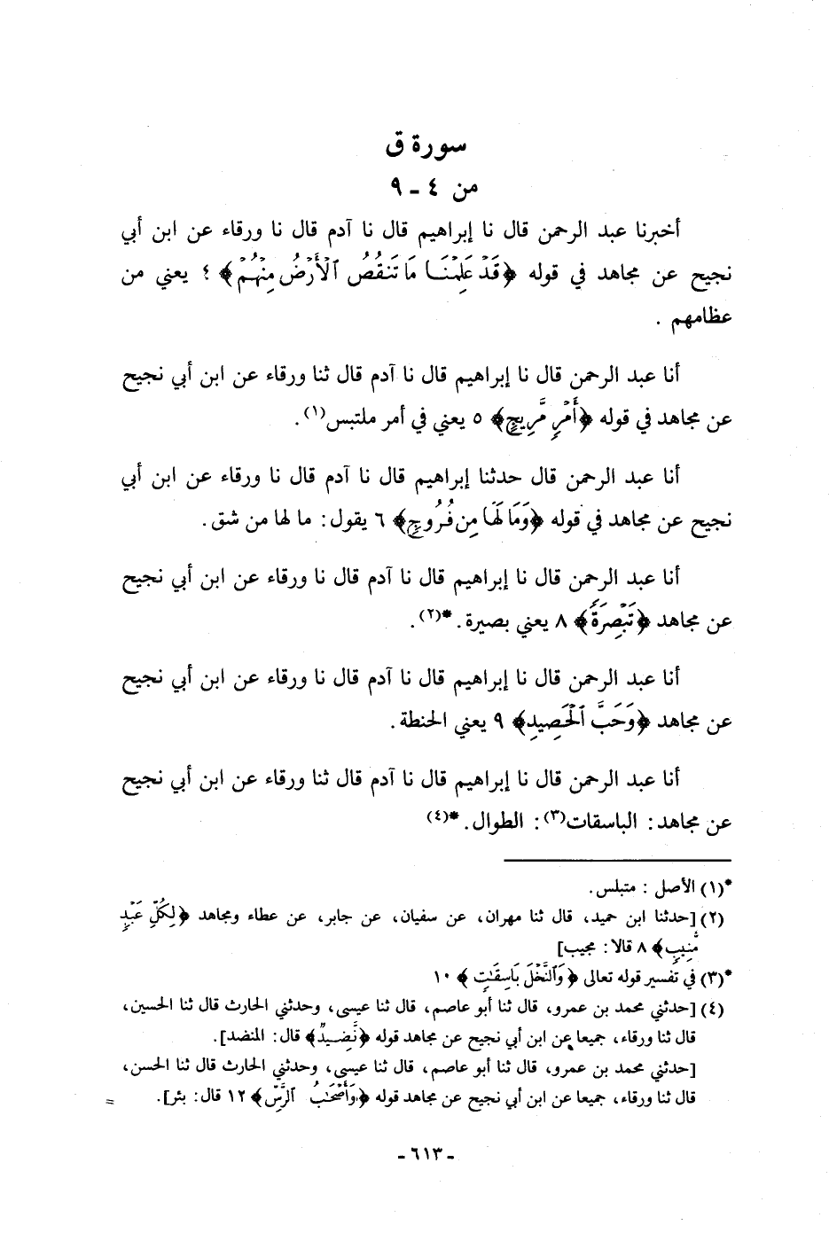 أنا عَبْدُ الرَّحْمَنِ، قَالَ: حَدَّثَنَا إِبْرَاهِيمُ، قَالَ: نا آدَمُ، قَالَ: نا وَرْقَاءُ، عَنِ ابْنِ أَبِي نَجِيحٍ، عَنْ مُجَاهِدٍ، فِي قَوْلِهِ: {وَمَا لَهَا مِنْ فَرُوجٍ} [ق: 6] يَقُولُ: «§مَا لَهَا مِنْ شَقٍّ»