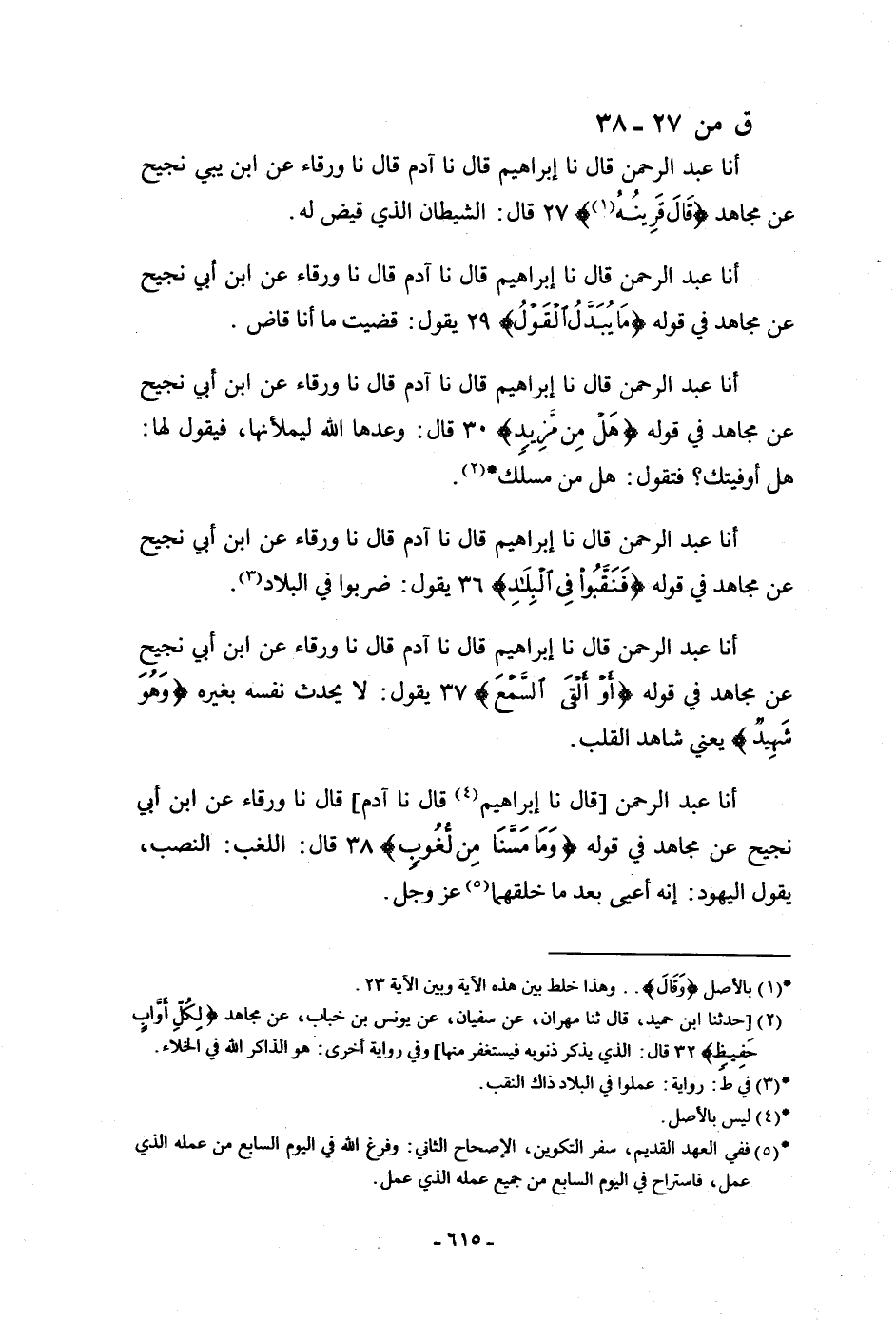 أنا عَبْدُ الرَّحْمَنِ، قَالَ: نا إِبْرَاهِيمُ، قَالَ: نا آدَمُ، قَالَ: نا وَرْقَاءُ، عَنِ ابْنِ أَبِي نَجِيحٍ، عَنْ مُجَاهِدٍ: {قَالَ قَرِينُهُ} [ق: 27] قَالَ: «§الشَّيْطَانُ الَّذِي قُيِّضَ لَهُ»