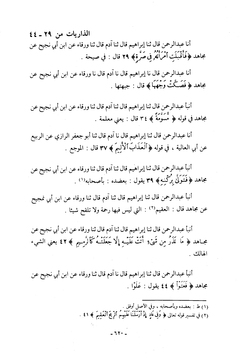 أنبأ عَبْدُ الرَّحْمَنِ، قَالَ: ثنا إِبْرَاهِيمُ، قَالَ: نا آدَمُ، قَالَ: ثنا وَرْقَاءُ، عَنِ ابْنِ أَبِي نَجِيحٍ، عَنْ مُجَاهِدٍ: {§فَعَتَوْا} [الذاريات: 44] يَقُولُ: «عَلَوْا»