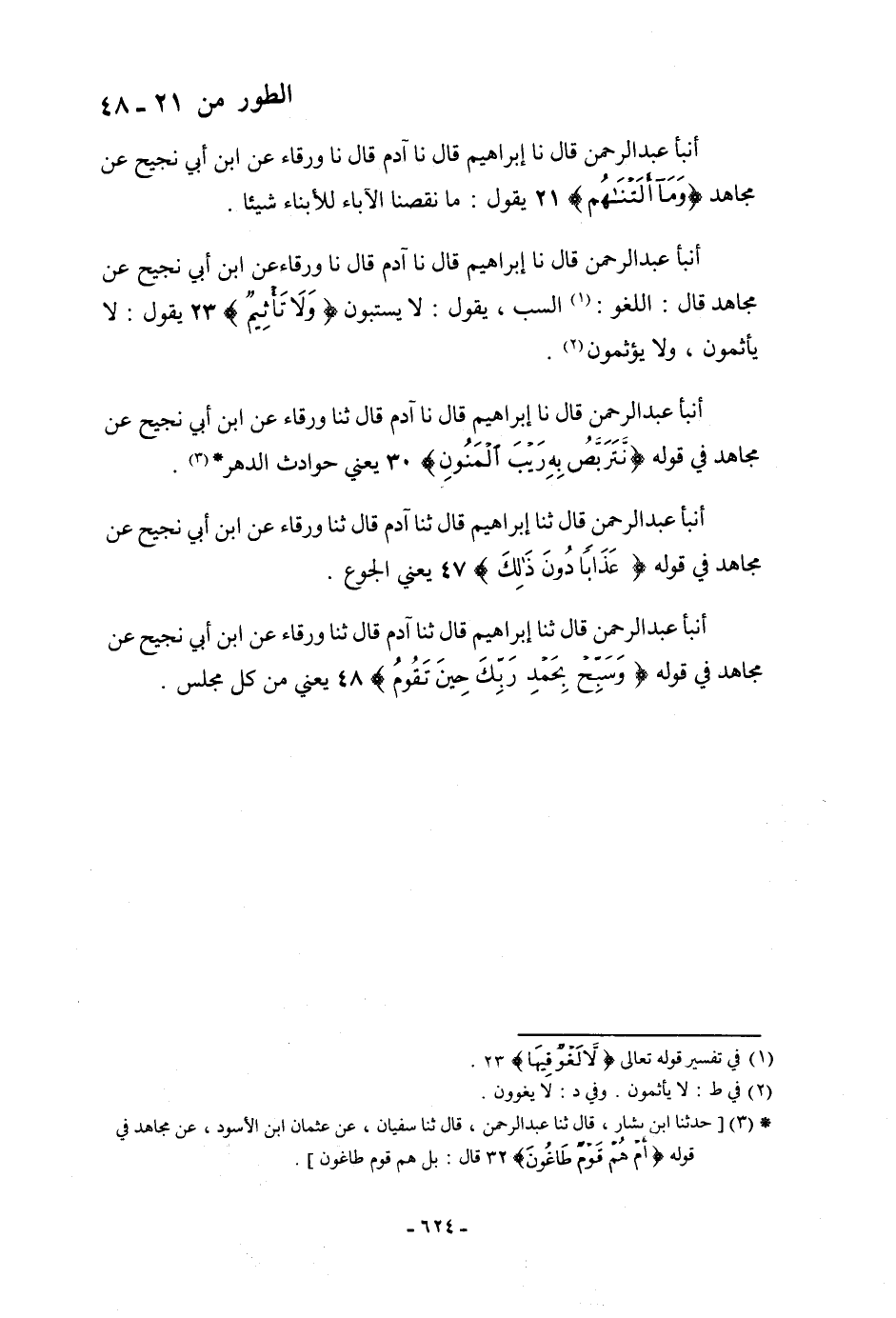 أنبأ عَبْدُ الرَّحْمَنِ، قَالَ: نا إِبْرَاهِيمُ، قَالَ: نا آدَمُ، قَالَ: نا وَرْقَاءُ، عَنِ ابْنِ أَبِي نَجِيحٍ، عَنْ مُجَاهِدٍ: {§وَمَا أَلَتْنَاهُمْ} [الطور: 21] يَقُولُ: «مَا نَقَصْنَا الْآبَاءَ لِلْأَبْنَاءِ شَيْئًا»