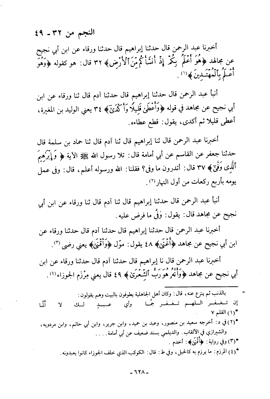 أَخْبَرَنَا عَبْدُ الرَّحْمَنِ، قَالَ: نا إِبْرَاهِيمُ، قَالَ: حَدَّثَنَا آدَمُ، قَالَ: حَدَّثَنَا وَرْقَاءُ، عَنِ ابْنِ أَبِي نَجِيحٍ، عَنْ مُجَاهِدٍ، {§وَأَنَّهُ هُوَ رَبُّ الشِّعْرَى} [النجم: 49] ، يَعْنِي: «مِرْزَمَ الْجَوْزَاءِ»