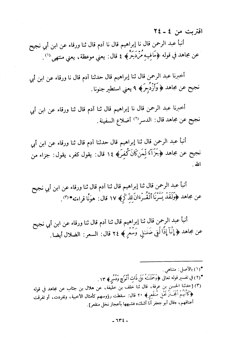 أنبأ عَبْدُ الرَّحْمَنِ، قَالَ: نا إِبْرَاهِيمُ، قَالَ: نا آدَمُ، قَالَ: ثنا وَرْقَاءُ، عَنِ ابْنِ أَبِي نَجِيحٍ، عَنْ مُجَاهِدٍ، فِي قَوْلِهِ: {§مَا فِيهِ مُزْدَجَرٌ} [القمر: 4] قَالَ: «يَعْنِي مَوْعِظَةً، يَعْنِي مُنْتَهَى»