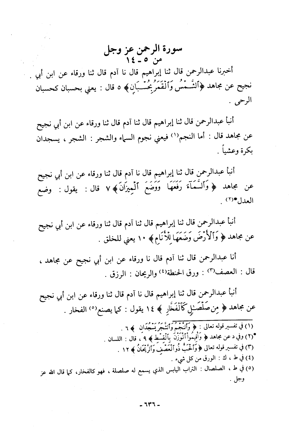 أَخْبَرَنَا عَبْدُ الرَّحْمَنِ، قَالَ: ثنا إِبْرَاهِيمُ، قَالَ: نا آدَمُ، قَالَ: ثنا وَرْقَاءُ، عَنِ ابْنِ أَبِي نَجِيحٍ، عَنْ مُجَاهِدٍ: {§الشَّمْسُ وَالْقَمَرُ بِحُسْبَانٍ} [الرحمن: 5] قَالَ: «يَعْنِي بِحُسْبَانٍ كَحُسْبَانِ الرَّحَى»