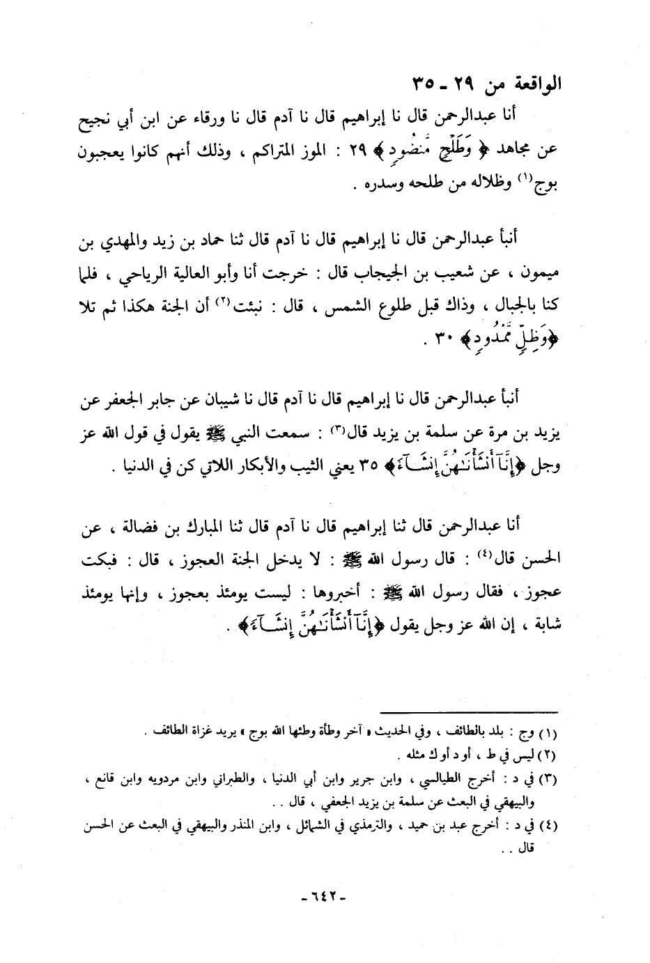 أنا عَبْدُ الرَّحْمَنِ، قَالَ: نا إِبْرَاهِيمُ، قَالَ: نا آدَمُ، قَالَ: نا وَرْقَاءُ، عَنِ ابْنِ أَبِي نَجِيحٍ، عَنْ مُجَاهِدٍ: {§وَطَلْحٍ مَنْضُودٍ} [الواقعة: 29] «الْمَوْزُ الْمُتَرَاكِمُ، وَذَلِكَ أَنَّهُمْ كَانُوا يَعْجَبُونَ بِوَجٍّ، وَظِلَالِهِ مِنْ طَلْحِهِ وَسِدْرِهِ»
