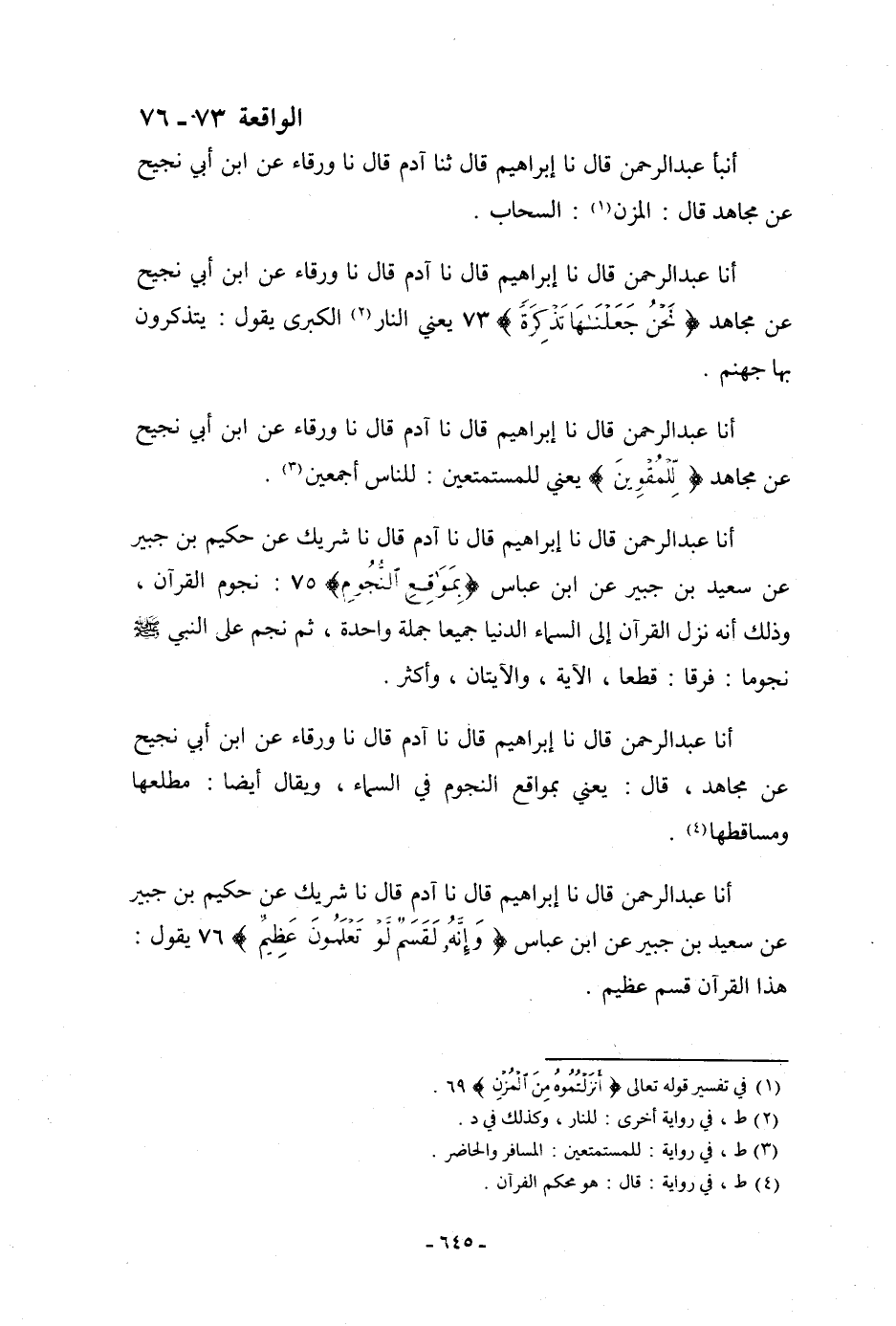 أنا عَبْدُ الرَّحْمَنِ، قَالَ: نا إِبْرَاهِيمُ، قَالَ: نا آدَمُ، قَالَ: نا وَرْقَاءُ، عَنِ ابْنِ أَبِي نَجِيحٍ، عَنْ مُجَاهِدٍ، قَالَ: " §يَعْنِي بِمَوَاقِعِ النُّجُومِ فِي السَّمَاءِ، وَيُقَالُ أَيْضًا: مَطْلَعُهَا وَمَسَاقِطُهَا "
