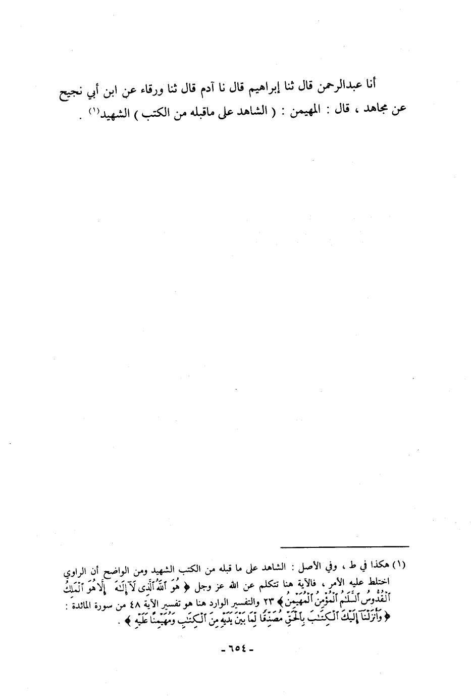 أنا عَبْدُ الرَّحْمَنِ، قَالَ: ثنا إِبْرَاهِيمُ، قَالَ: نا آدَمُ، قَالَ: ثنا وَرْقَاءُ، عَنِ ابْنِ أَبِي نَجِيحٍ، عَنْ مُجَاهِدٍ، قَالَ: " §الْمُهَيْمِنُ: الشَّاهِدُ عَلَى مَا قَبْلَهُ مِنَ الْكُتُبِ " الشَّهِيدُ