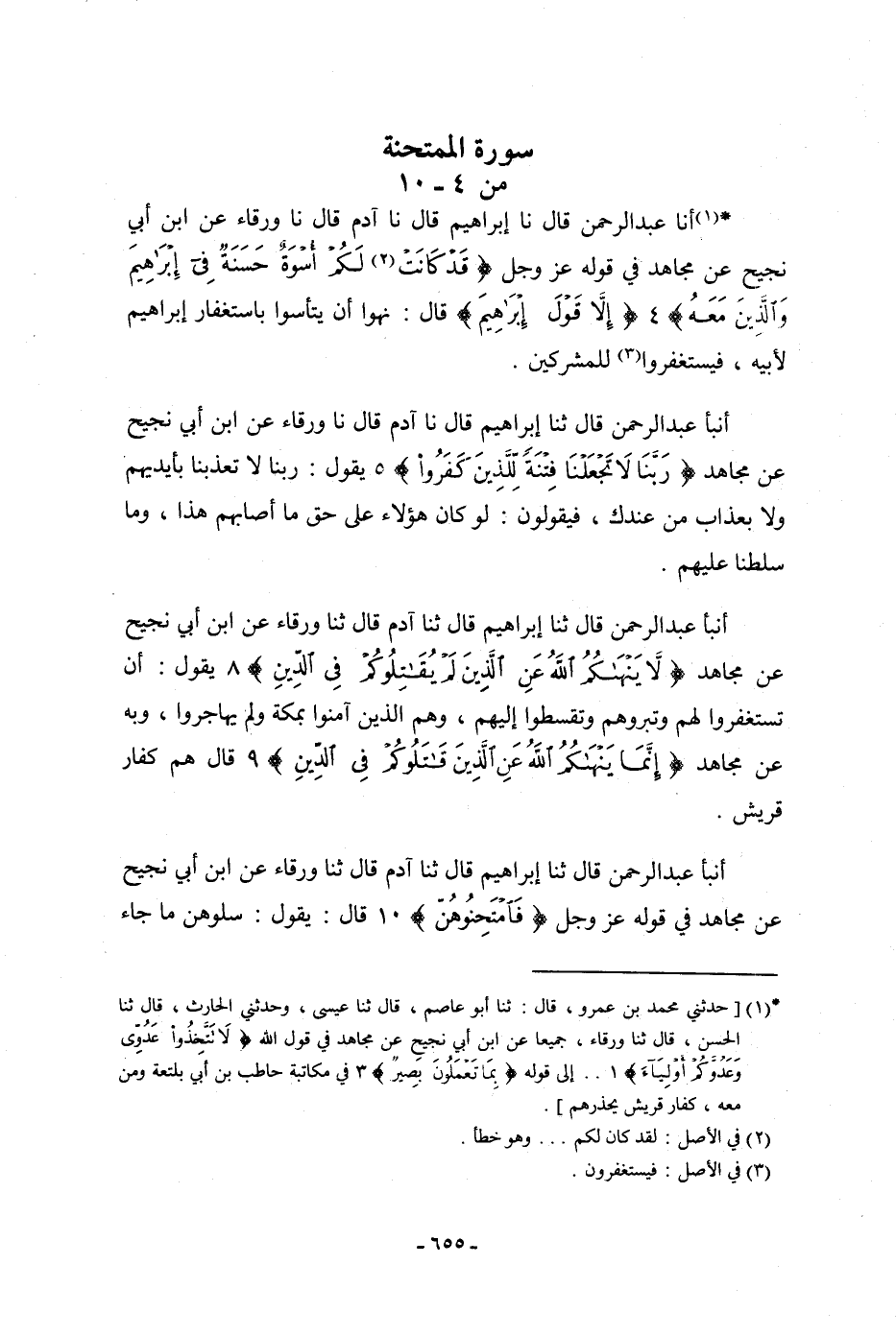 أنا عَبْدُ الرَّحْمَنِ، قَالَ: نا إِبْرَاهِيمُ، قَالَ: نا آدَمُ، قَالَ: نا وَرْقَاءُ، عَنِ ابْنِ أَبِي نَجِيحٍ، عَنْ مُجَاهِدٍ، فِي قَوْلِهِ عَزَّ وَجَلَّ: {قَدْ كَانَتْ لَكُمْ أُسْوَةٌ حَسَنَةٌ فِي إِبْرَاهِيمَ وَالَّذِينَ مَعَهُ} [الممتحنة: 4] {إِلَّا قَوْلَ إِبْرَاهِيمَ} [الممتحنة: 4] قَالَ: «§نُهُوا أَنْ يَتَأَسَّوْا بِاسْتِغْفَارِ إِبْرَاهِيمَ لِأَبِيهِ فَيَسْتَغْفِرُوا لِلْمُشْرِكِينَ»