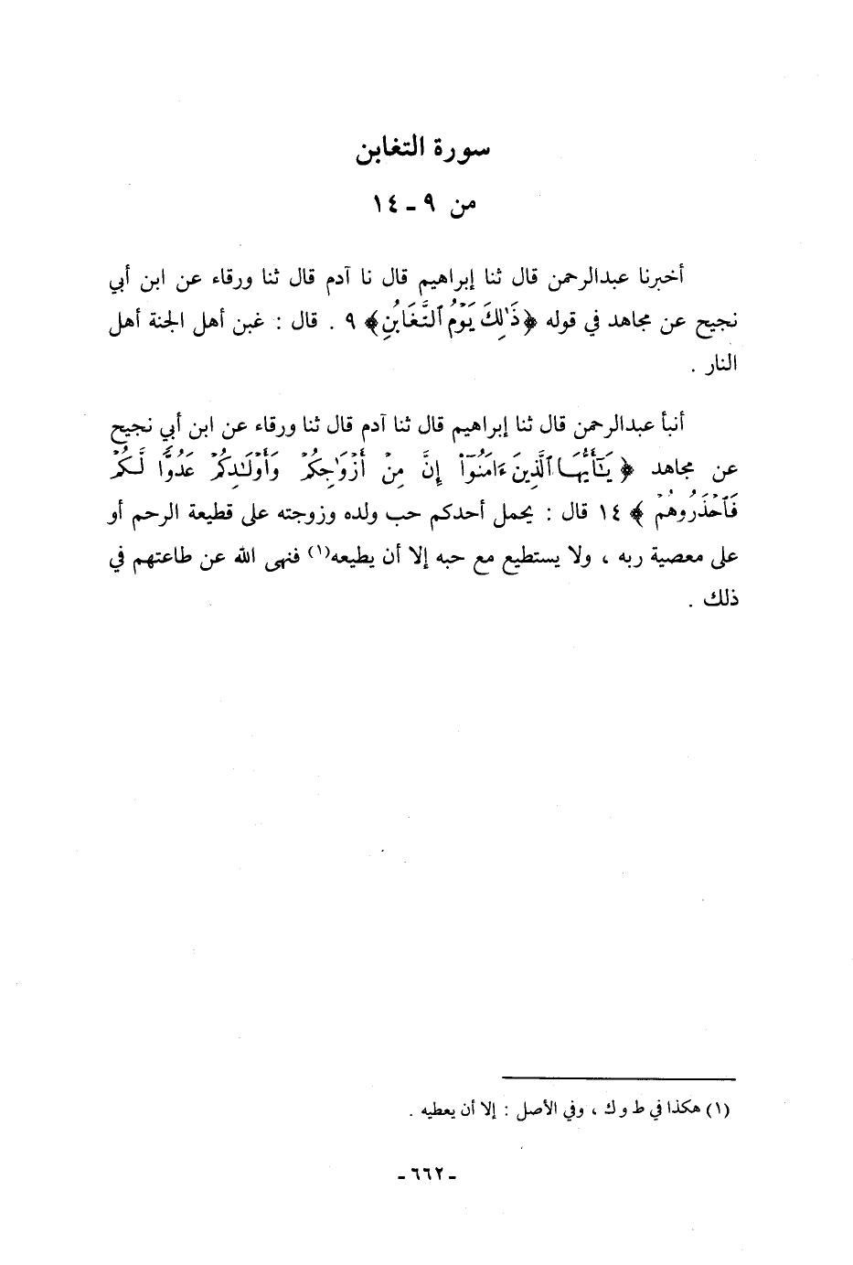 أنبأ عَبْدُ الرَّحْمَنِ، قَالَ: ثنا إِبْرَاهِيمُ، قَالَ: ثنا آدَمُ، قَالَ: ثنا وَرْقَاءُ، عَنِ ابْنِ أَبِي نَجِيحٍ، عَنْ مُجَاهِدٍ: {يَا أَيُّهَا الَّذِينَ آمَنُوا إِنَّ مِنْ أَزْوَاجِكُمْ وَأَوْلَادِكُمْ عَدُوًّا لَكُمْ فَاحْذَرُوهُمْ} [التغابن: 14] قَالَ: «§يَحْمِلُ أَحَدَكُمْ حُبُّ وَلَدِهِ وَزَوْجَتِهِ عَلَى قَطِيعَةِ الرَّحِمِ، أَوْ عَلَى مَعْصِيَةِ رَبِّهِ وَلَا يَسْتَطِيعُ مَعَ حُبِّهِ إِلَّا أَنْ يُطِيعَهُ فَنَهَى اللَّهُ عَنْ طَاعَتِهِمْ فِي ذَلِكَ»