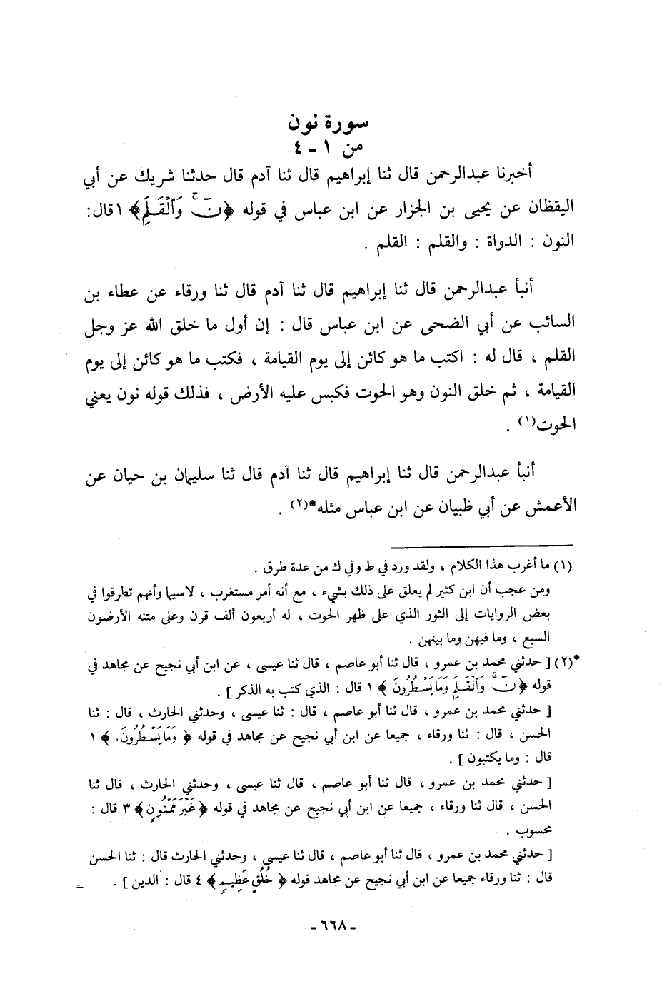 أنبأ عَبْدُ الرَّحْمَنِ، قَالَ: ثنا إِبْرَاهِيمُ، قَالَ: ثنا آدَمُ، قَالَ: ثنا وَرْقَاءُ، عَنْ عَطَاءِ بْنِ السَّائِبِ، عَنْ أَبِي الضُّحَى، عَنِ ابْنِ عَبَّاسٍ، قَالَ: " إِنَّ §أَوَّلَ مَا خَلَقَ اللَّهُ عَزَّ وَجَلَّ الْقَلَمَ، قَالَ لَهُ: اكْتُبْ مَا هُوَ كَائِنٌ إِلَى يَوْمِ الْقِيَامَةِ، فَكَتَبَ مَا هُوَ كَائِنٌ إِلَى يَوْمِ الْقِيَامَةِ، ثُمَّ خَلَقَ النُّونْ وَهُوَ الْحُوتُ، فَكَبَسَ عَلَيْهِ الْأَرْضَ، فَذَلِكَ قَوْلُهُ نُونْ يَعْنِي الْحُوتَ ". أنبأ عَبْدُ الرَّحْمَنِ، قَالَ: ثنا إِبْرَاهِيمُ، قَالَ: ثنا آدَمُ، قَالَ: ثنا سُلَيْمَانُ بْنُ حَبَّانَ، عَنِ الْأَعْمَشِ، عَنْ أَبِي ظَبْيَانَ، عَنِ ابْنِ عَبَّاسٍ، مِثْلَهُ