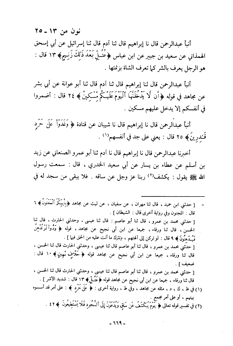 أنبأ عَبْدُ الرَّحْمَنِ، قَالَ: نا إِبْرَاهِيمُ، قَالَ: ثنا آدَمُ، قَالَ: ثنا إِسْرَائِيلُ، عَنْ أَبِي إِسْحَاقَ الْهَمَذَانِيِّ، عَنْ سَعِيدِ بْنِ جُبَيْرٍ، عَنِ ابْنِ عَبَّاسٍ: {عُتُلٍّ بَعْدَ ذَلِكَ زَنِيمٍ} [القلم: 13] قَالَ: «§هُوَ الرَّجُلُ يُعْرَفُ بِالشَّرِّ كَمَا تُعْرَفُ الشَّاةُ بِزَنَمَتِهَا»