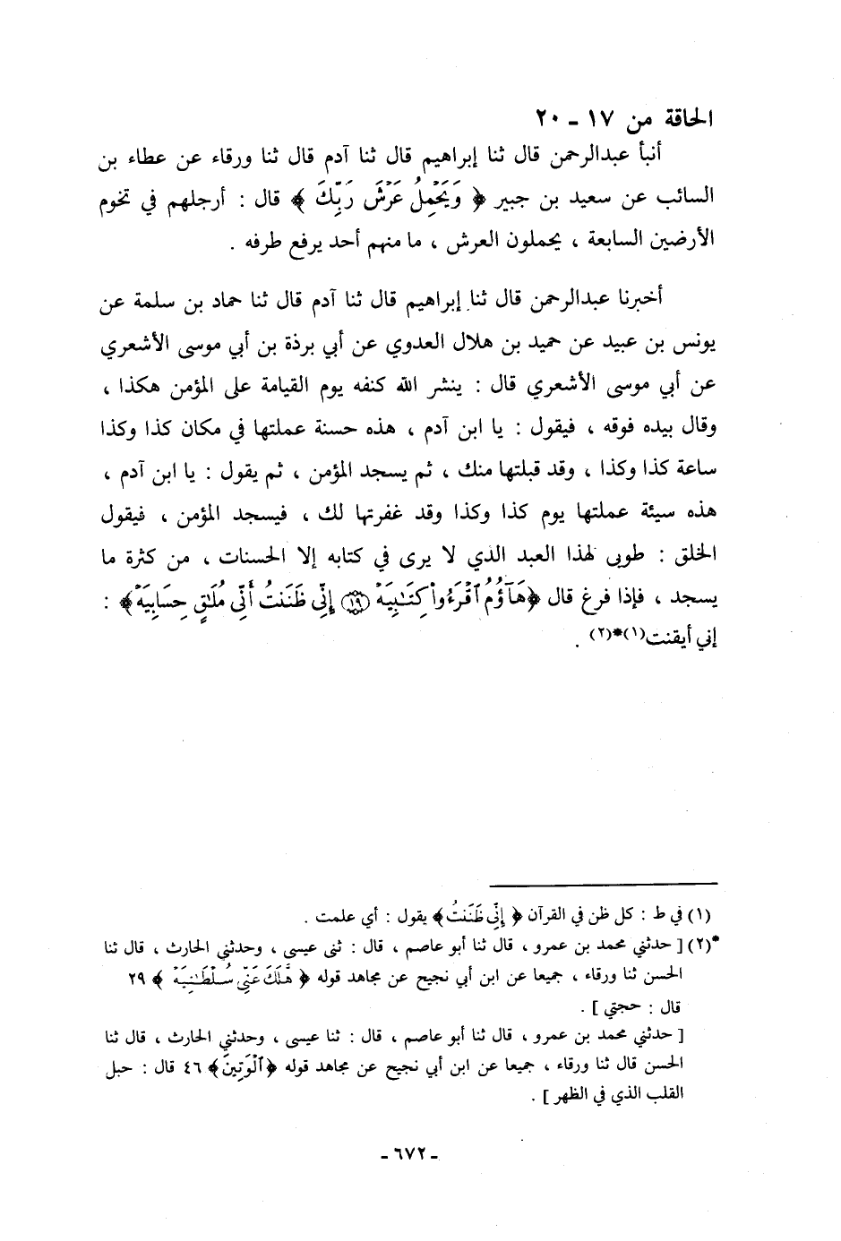 أنبأ عَبْدُ الرَّحْمَنِ، قَالَ: ثنا إِبْرَاهِيمُ، قَالَ: ثنا آدَمُ، قَالَ: ثنا وَرْقَاءُ، عَنْ عَطَاءِ بْنِ السَّائِبِ، عَنْ سَعِيدِ بْنِ جُبَيْرٍ: {وَيَحْمِلُ عَرْشَ رَبِّكَ} [الحاقة: 17] قَالَ: «§أَرْجُلُهُمْ فِي تُخُومِ الْأَرَضِينَ السَّابِعَةِ، يَحْمِلُونَ الْعَرْشَ مَا مِنْهُمْ أَحَدٌ يَرْفَعُ طَرْفَهُ»