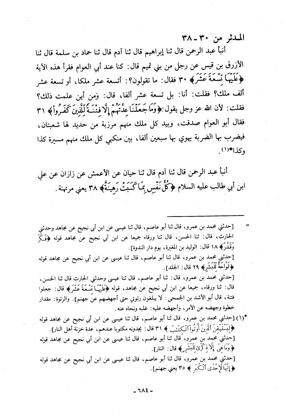 أنبأ عَبْدُ الرَّحْمَنِ، قَالَ: ثنا إِبْرَاهِيمُ، قَالَ: ثنا آدَمُ، قَالَ: ثنا حَبَّانُ، عَنِ الْأَعْمَشِ، عَنْ زَاذَانَ، عَنْ عَلِيِّ بْنِ أَبِي طَالِبٍ عَلَيْهِ السَّلَامُ: {§كُلُّ نَفْسٍ بِمَا كَسَبَتْ رَهِينَةٌ} [المدثر: 38] ، يَعْنِي: «مُرْتَهَنَةً»