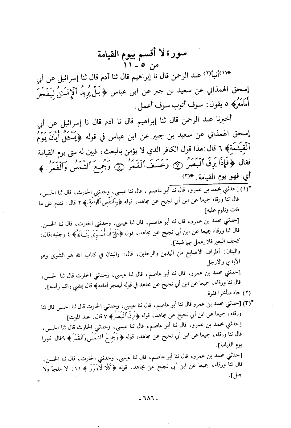 أنبأ عَبْدُ الرَّحْمَنِ، قَالَ: نا إِبْرَاهِيمُ، قَالَ: ثنا آدَمُ، قَالَ: ثنا إِسْرَائِيلُ، عَنْ أَبِي إِسْحَاقَ الْهَمْدَانِيِّ، عَنْ سَعِيدِ بْنِ جُبَيْرٍ، عَنِ ابْنِ عَبَّاسٍ: {§بَلْ يُرِيدُ الْإِنْسَانُ لِيَفْجُرَ أَمَامَهُ} [القيامة: 5] يَقُولُ: «سَوْفَ أَتُوبُ، سَوْفَ أَعْمَلُ»