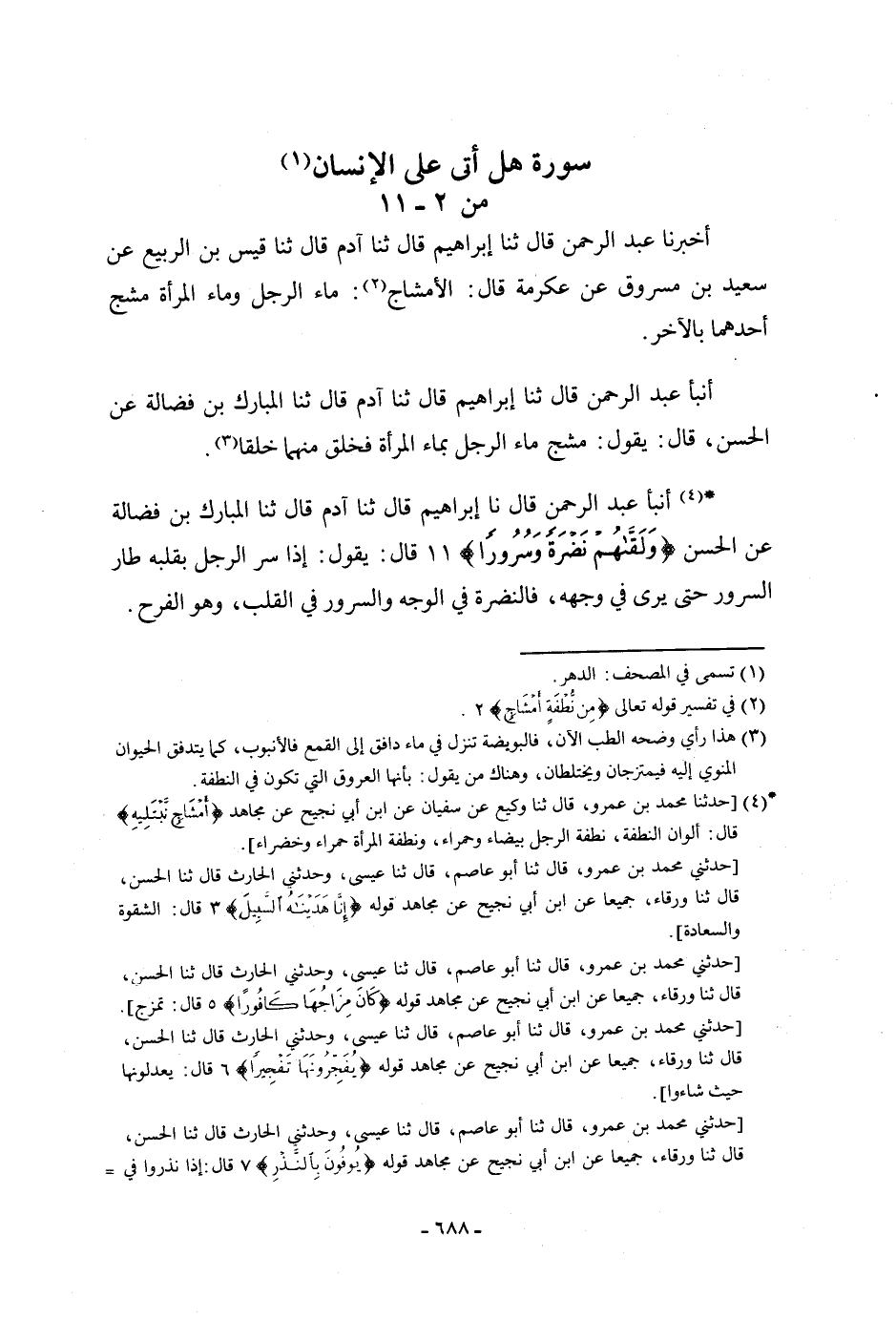 أنبأ عَبْدُ الرَّحْمَنِ، قَالَ: نا إِبْرَاهِيمُ، قَالَ: ثنا آدَمُ، قَالَ: ثنا الْمُبَارَكُ بْنُ فَضَالَةَ، عَنِ الْحَسَنِ: {وَلَقَّاهُمْ نَضْرَةً وَسُرُورًا} [الإنسان: 11] قَالَ: " يَقُولُ: إِذَا §سُرَّ الرَّجُلُ بِقَلْبِهِ طَارَ السُّرُورُ حَتَّى يُرَى فِي وَجْهِهِ، فَالنَّضْرَةُ فِي الْوَجْهِ، وَالسُّرُورُ فِي الْقَلْبِ وَهُوَ الْفَرَحُ "