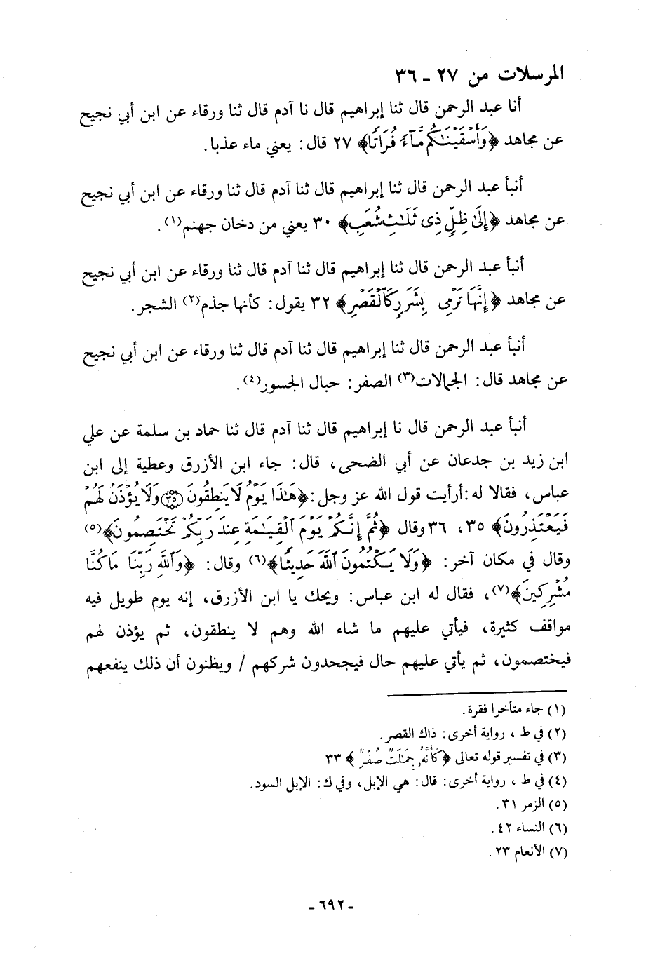 أنا عَبْدُ الرَّحْمَنِ، قَالَ: ثنا إِبْرَاهِيمُ، قَالَ: نا آدَمُ، قَالَ: ثنا وَرْقَاءُ، عَنِ ابْنِ أَبِي نَجِيحٍ، عَنْ مُجَاهِدٍ: {§وَأَسْقَيْنَاكُمْ مَاءً فُرَاتًا} [المرسلات: 27] قَالَ: «يَعْنِي مَاءً عَذْبًا»