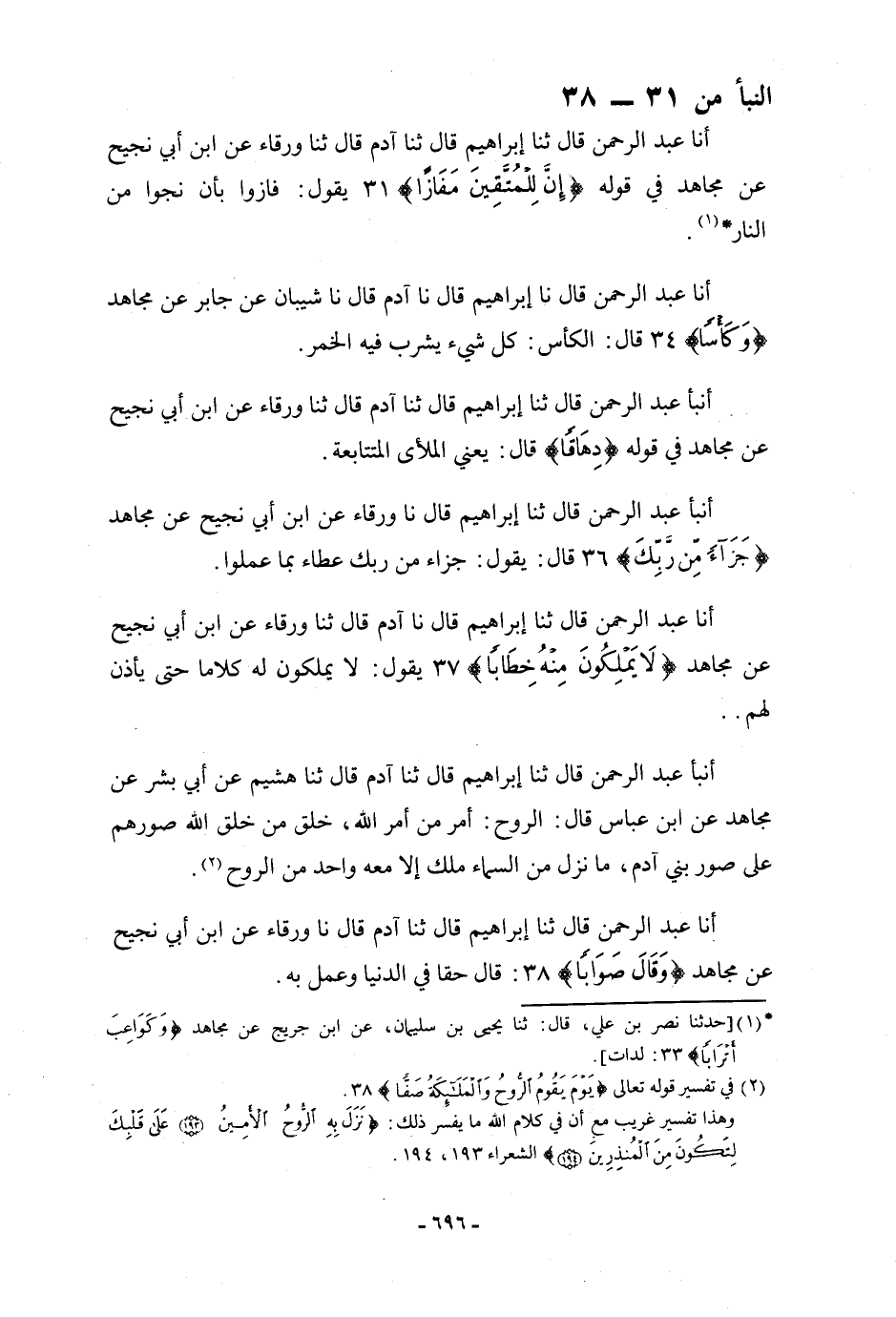 أنا عَبْدُ الرَّحْمَنِ، قَالَ: ثنا إِبْرَاهِيمُ، قَالَ: ثنا آدَمُ، قَالَ: ثنا وَرْقَاءُ، عَنِ ابْنِ أَبِي نَجِيحٍ، عَنْ مُجَاهِدٍ، فِي قَوْلِهِ: {إِنَّ لِلْمُتَّقِينَ مَفَازًا} [النبأ: 31] يَقُولُ: «§فَازُوا بِأَنْ نَجَوْا مِنَ النَّارِ»