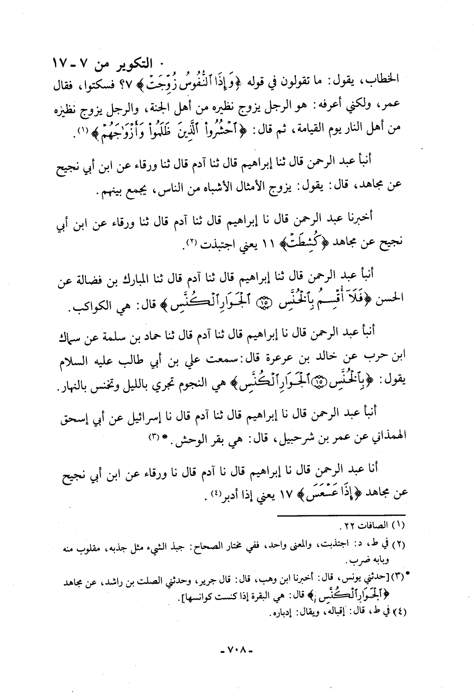 أنبأ عَبْدُ الرَّحْمَنِ، قَالَ: نا إِبْرَاهِيمُ، قَالَ: ثنا آدَمُ، قَالَ: ثنا حَمَّادُ بْنُ سَلَمَةَ، عَنْ سِمَاكِ بْنِ حَرْبٍ، عَنْ خَالِدِ بْنِ عَرْعَرَةَ، قَالَ: سَمِعْتُ عَلِيَّ بْنَ أَبِي طَالِبٍ عَلَيْهِ السَّلَامُ يَقُولُ: {§بِالْخُنَّسِ الْجَوَارِ الْكُنَّسِ} [التكوير: 16] «هِيَ النُّجُومُ تَجْرِي بِاللَّيْلِ، وَتُخَنَّسُ بِالنَّهَارِ» . أنبأ عَبْدُ الرَّحْمَنِ، قَالَ: نا إِبْرَاهِيمُ، قَالَ: ثنا آدَمُ، قَالَ: نا إِسْرَائِيلُ، عَنْ أَبِي إِسْحَاقَ الْهَمْدَانِيِّ، عَنْ عُمَرِ بْنِ شُرَحْبِيلَ، قَالَ: هِيَ بَقَرُ الْوَحْشِ