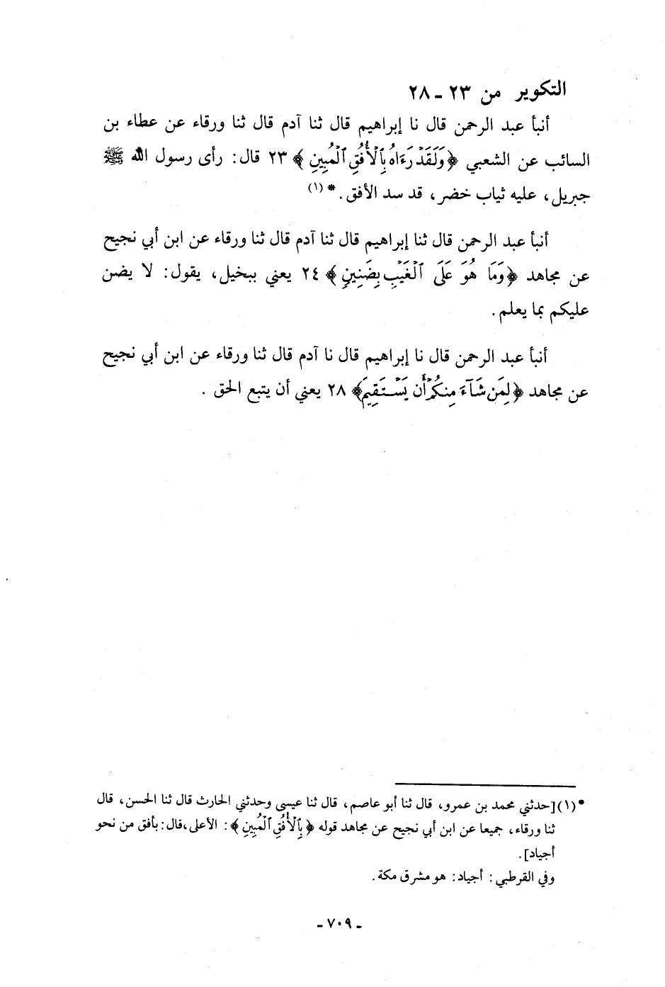 أنبأ عَبْدُ الرَّحْمَنِ، قَالَ: ثنا إِبْرَاهِيمُ، قَالَ: ثنا آدَمُ، قَالَ: ثنا وَرْقَاءُ، عَنِ ابْنِ أَبِي نَجِيحٍ، عَنْ مُجَاهِدٍ: {§وَمَا هُوَ عَلَى الْغَيْبِ بِضَنِينٍ} [التكوير: 24] يَعْنِي بِبَخِيلٍ، يَقُولُ: «لَا يَضِنُّ عَلَيْكُمْ بِمَا يَعْلَمُ»
