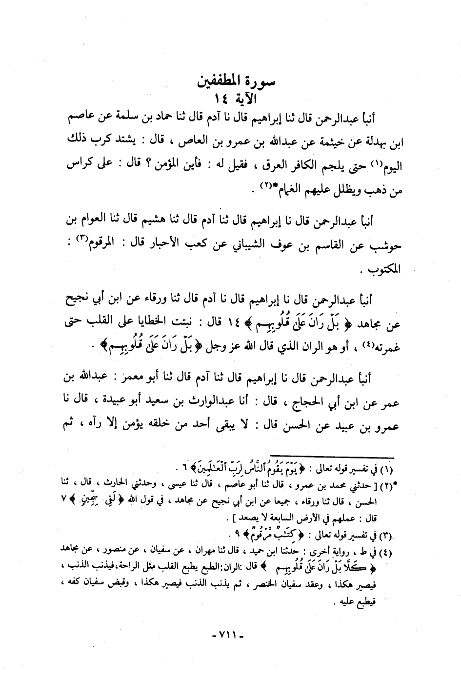 أنبأ عَبْدُ الرَّحْمَنِ، قَالَ: نا إِبْرَاهِيمُ، قَالَ: نا آدَمُ، قَالَ: ثنا وَرْقَاءُ، عَنِ ابْنِ أَبِي نَجِيحٍ، عَنْ مُجَاهِدٍ: {بَلْ رَانَ عَلَى قُلُوبِهِمْ} [المطففين: 14] قَالَ: " §نَبَتَتِ الْخَطَايَا عَلَى الْقَلْبِ حَتَّى غَمَرَتْهُ، أَوْ هُوَ الرَّانُ الَّذِي قَالَ اللَّهُ عَزَّ وَجَلَّ: {بَلْ رَانَ عَلَى قُلُوبِهِمْ} [المطففين: 14] "