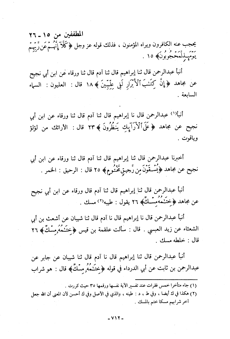 أَخْبَرَنَا عَبْدُ الرَّحْمَنِ، قَالَ: ثنا إِبْرَاهِيمُ، قَالَ: ثنا آدَمُ، قَالَ: ثنا وَرْقَاءُ، عَنِ ابْنِ أَبِي نَجِيحٍ، عَنْ مُجَاهِدٍ: {§يُسْقَوْنَ مِنْ رَحِيقٍ مَخْتُومٍ} [المطففين: 25] قَالَ: " الرَّحِيقُ: الْخَمْرُ "
