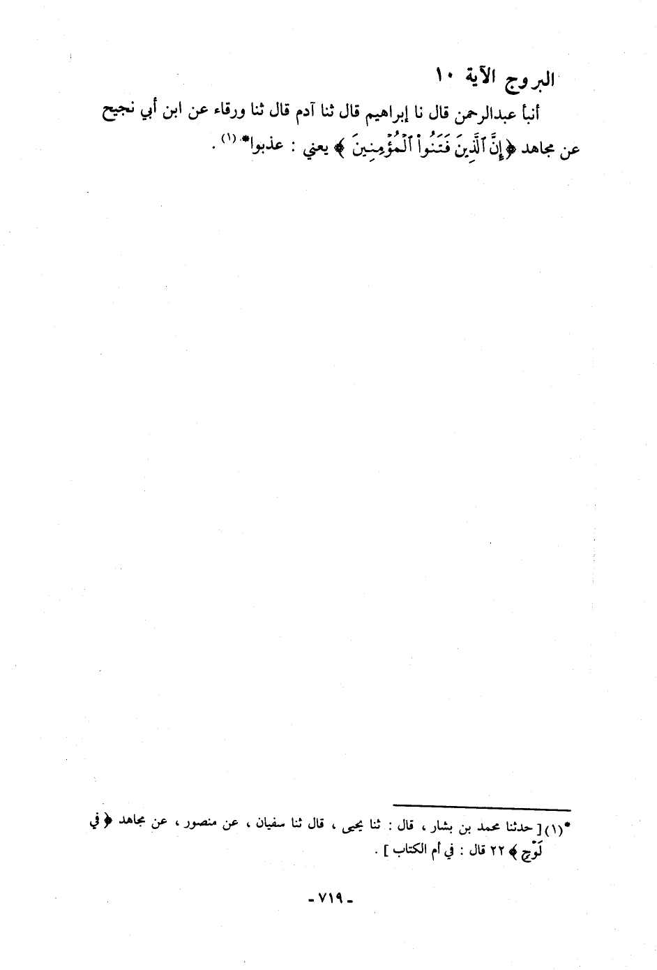 أنبأ عَبْدُ الرَّحْمَنِ، قَالَ: نا إِبْرَاهِيمُ، قَالَ: ثنا آدَمُ، قَالَ: ثنا وَرْقَاءُ، عَنِ ابْنِ أَبِي نَجِيحٍ، عَنْ مُجَاهِدٍ: {§إِنَّ الَّذِينَ فَتَنُوا الْمُؤْمِنِينَ} [البروج: 10] ، يَعْنِي: «عَذَّبُوا»