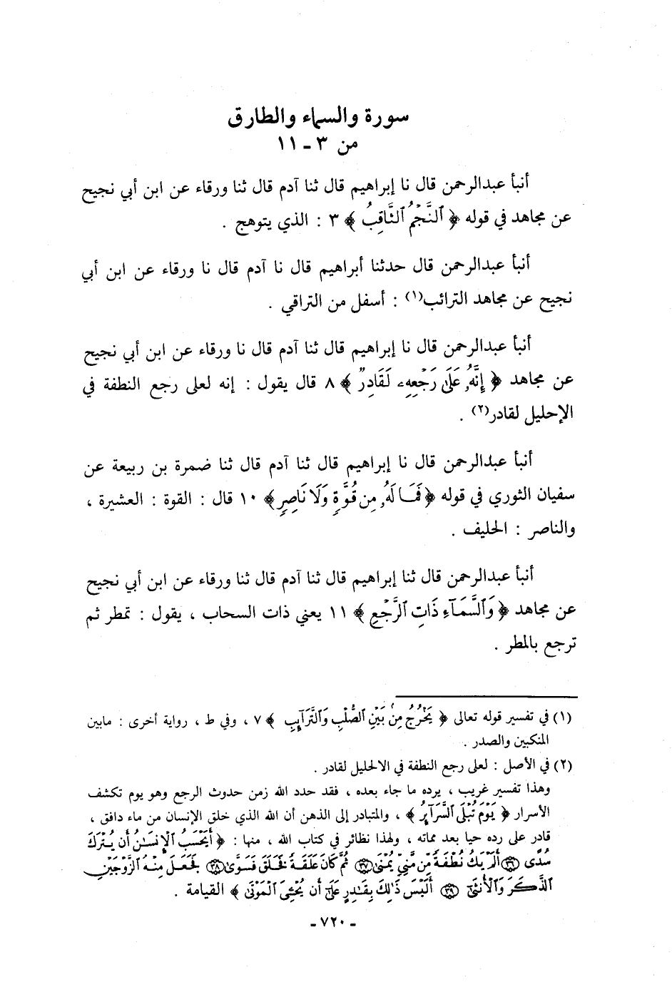 أنبأ عَبْدُ الرَّحْمَنِ، قَالَ: نا إِبْرَاهِيمُ، قَالَ: ثنا آدَمُ قَالَ: نا وَرْقَاءُ، عَنِ ابْنِ أَبِي نَجِيحٍ، عَنْ مُجَاهِدٍ: {إِنَّهُ عَلَى رَجْعِهِ لَقَادِرٌ} [الطارق: 8] ، قَالَ: " §يَقُولُ: إِنَّهُ لَعَلَى رَجْعِ النُّطْفَةِ فِي الْإِحْلِيلِ لَقَادِرٌ "