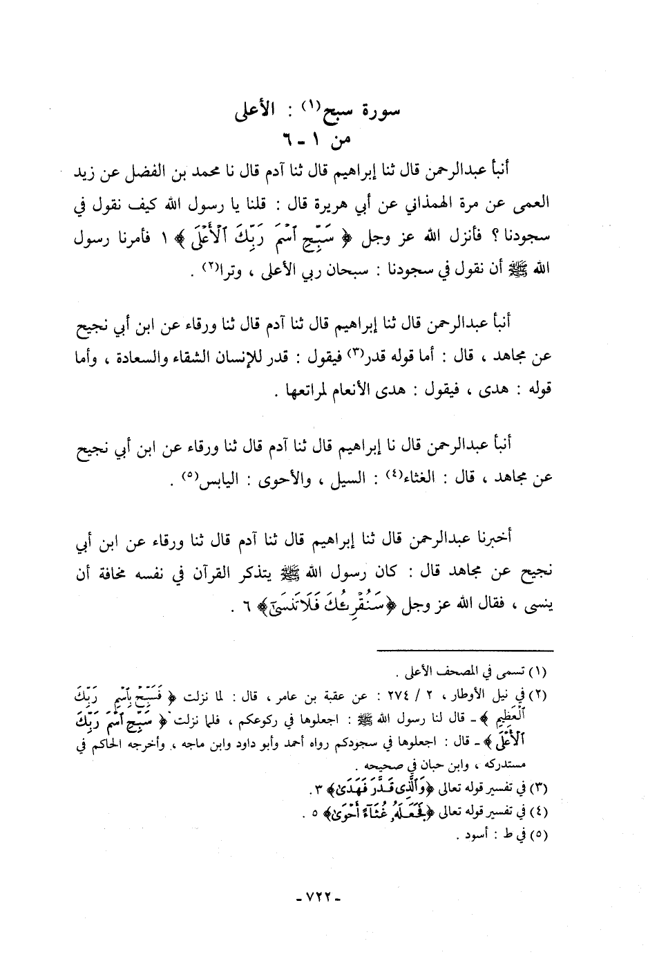 أَخْبَرَنَا عَبْدُ الرَّحْمَنِ، قَالَ: ثنا إِبْرَاهِيمُ، قَالَ: ثنا آدَمُ، قَالَ: ثنا وَرْقَاءُ، عَنِ ابْنِ أَبِي نَجِيحٍ، عَنْ مُجَاهِدٍ، قَالَ: «كَانَ رَسُولُ اللَّهِ صَلَّى اللَّهُ عَلَيْهِ وَسَلَّمَ §يَتَذَكَّرُ الْقُرْآنَ فِي نَفْسِهِ مَخَافَةَ أَنْ يَنْسَى» ، فَقَالَ اللَّهُ عَزَّ وَجَلَّ: {سَنُقْرِئُكَ فَلَا تَنْسَى}