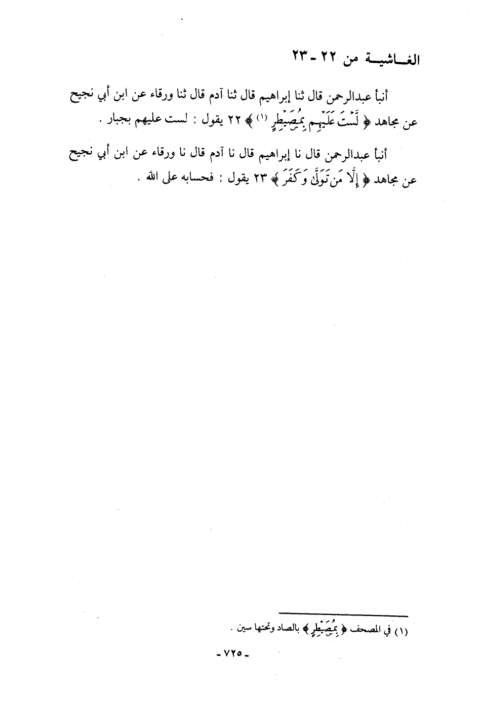 أنبأ عَبْدُ الرَّحْمَنِ، قَالَ: ثنا إِبْرَاهِيمُ، قَالَ: ثنا آدَمُ، قَالَ: ثنا وَرْقَاءُ، عَنِ ابْنِ أَبِي نَجِيحٍ، عَنْ مُجَاهِدٍ: {لَسْتَ عَلَيْهِمْ بِمُصَيْطِرٍ} [الغاشية: 22] يَقُولُ: «§لَسْتَ عَلَيْهِمْ بِجَبَّارٍ»