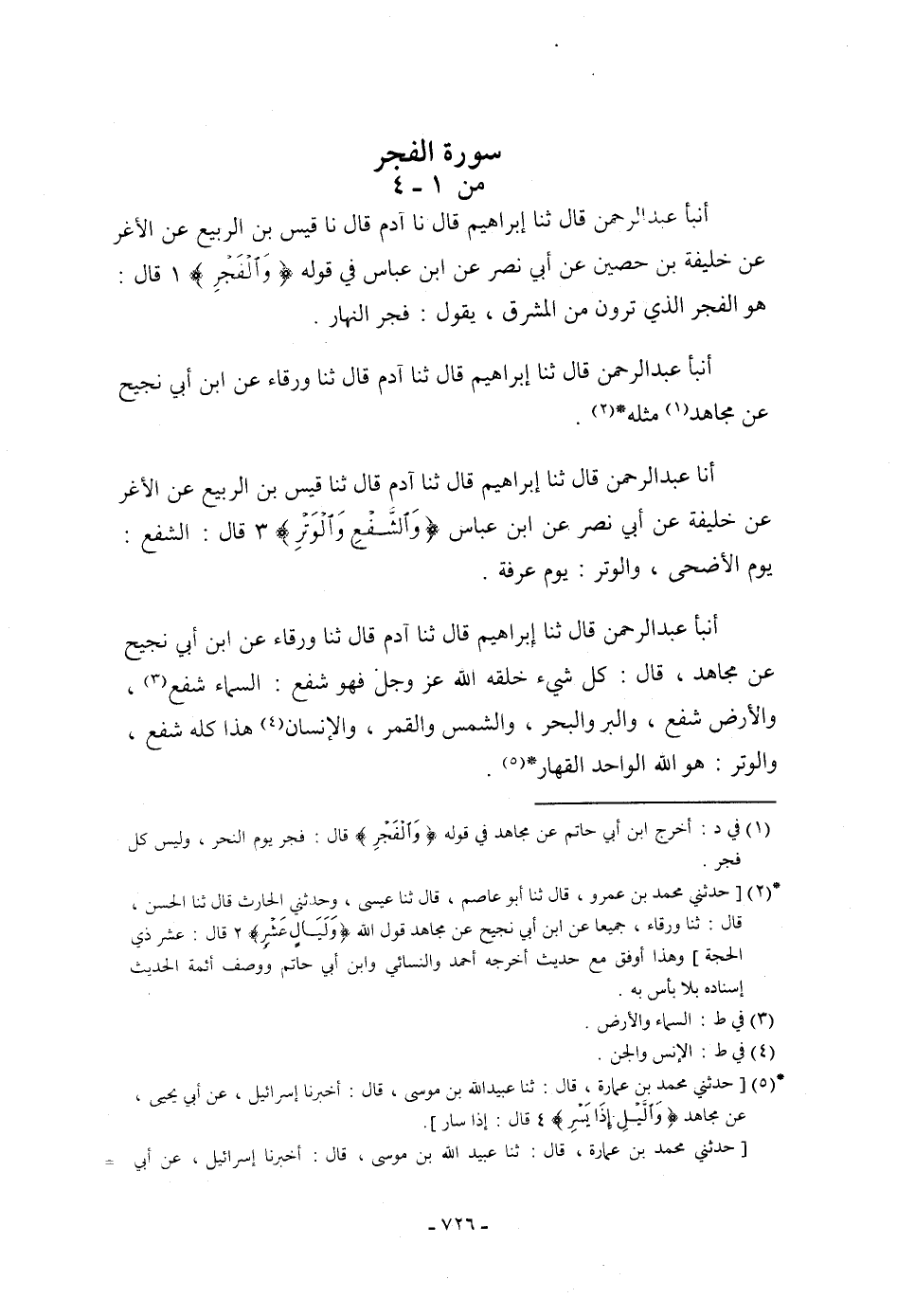 أنبأ عَبْدُ الرَّحْمَنِ، قَالَ: ثنا إِبْرَاهِيمُ، قَالَ: نا آدَمُ، قَالَ: نا قَيْسُ بْنُ الرَّبِيعِ، عَنِ الْأَغَرِّ، عَنْ خَلِيفَةَ بْنِ حُصَيْنٍ، عَنْ أَبِي نَصْرٍ، عَنِ ابْنِ عَبَّاسٍ، فِي قَوْلِهِ: {وَالْفَجْرِ} [الفجر: 1] قَالَ: " §هُوَ الْفَجْرُ الَّذِي تَرَوْنَ مِنَ الْمَشْرِقِ يَقُولُ: فَجْرُ النَّهَارِ ". أنبأ عَبْدُ الرَّحْمَنِ، قَالَ: ثنا إِبْرَاهِيمُ، قَالَ: ثنا آدَمُ، قَالَ: ثنا وَرْقَاءُ، عَنِ ابْنِ أَبِي نَجِيحٍ، عَنْ مُجَاهِدٍ، مِثْلَهُ