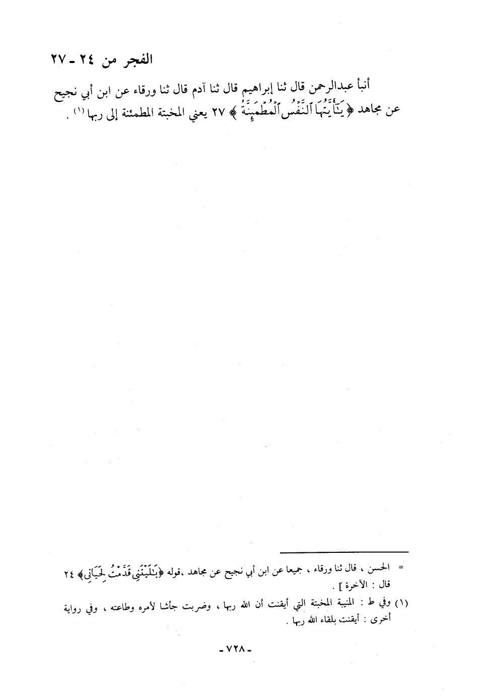 أنبأ عَبْدُ الرَّحْمَنِ، قَالَ: ثنا إِبْرَاهِيمُ، قَالَ: ثنا آدَمُ، قَالَ: ثنا وَرْقَاءُ، عَنِ ابْنِ أَبِي نَجِيحٍ، عَنْ مُجَاهِدٍ: {§يَا أَيَّتُهَا النَّفْسُ الْمُطْمَئِنَّةُ} [الفجر: 27] ، يَعْنِي: «الْمُخْبِتَةَ الْمُطْمَئِنَّةَ إِلَى رَبِّهَا»