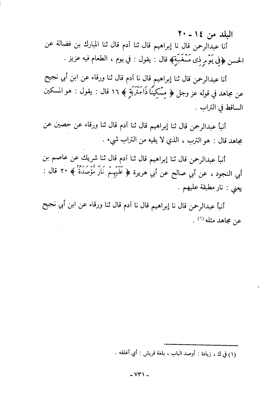 أنبأ عَبْدُ الرَّحْمَنِ، قَالَ: ثنا إِبْرَاهِيمُ، قَالَ: ثنا آدَمُ، قَالَ: ثنا شَرِيكٌ، عَنْ عَاصِمِ بْنِ أَبِي النَّجُودِ، عَنْ أَبِي صَالِحٍ، عَنْ أَبِي هُرَيْرَةَ: {§عَلَيْهِمْ نَارٌ مُؤْصَدَةٌ} [البلد: 20] قَالَ: «يَعْنِي نَارًا مُطْبِقَةً عَلَيْهِمْ» . أنبأ عَبْدُ الرَّحْمَنِ، قَالَ: نا إِبْرَاهِيمُ، قَالَ: نا آدَمُ، قَالَ: ثنا وَرْقَاءُ، عَنِ ابْنِ أَبِي نَجِيحٍ، عَنْ مُجَاهِدٍ، مِثْلَهُ