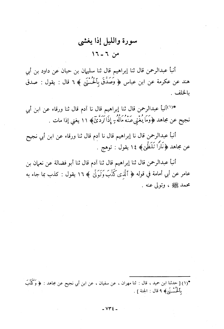 أنبأ عَبْدُ الرَّحْمَنِ، قَالَ: ثنا إِبْرَاهِيمُ، قَالَ: ثنا آدَمُ، قَالَ: ثنا أَبُو فَضَالَةَ، عَنْ لُقْمَانَ بْنِ عَامِرٍ، عَنْ أَبِي أُمَامَةَ، فِي قَوْلِهِ: {الَّذِي كَذَّبَ وَتَوَلَّى} [الليل: 16] يَقُولُ: «§كَذَّبَ بِمَا جَاءَ بِهِ مُحَمَّدٌ صَلَّى اللَّهُ عَلَيْهِ وَسَلَّمَ وَتَوَلَّى عَنْهُ»