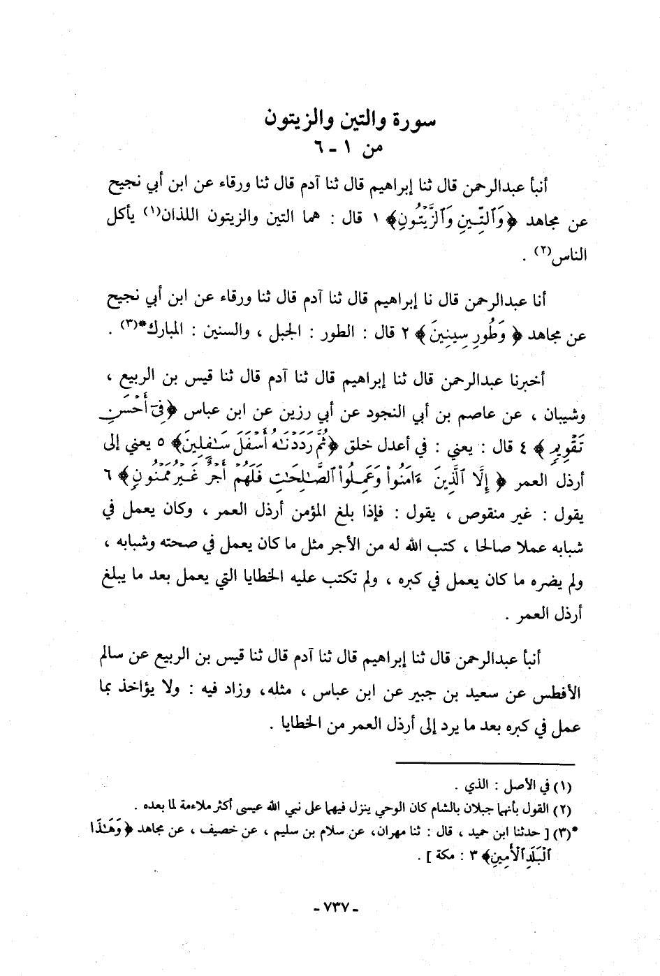 أنا عَبْدُ الرَّحْمَنِ، قَالَ: نا إِبْرَاهِيمُ، قَالَ: ثنا آدَمُ، قَالَ: ثنا وَرْقَاءُ، عَنِ ابْنِ أَبِي نَجِيحٍ، عَنْ مُجَاهِدٍ: {§وَطُورِ سِينِينَ} [التين: 2] قَالَ: " الطُّورُ: الْجَبَلُ، وَالسِّينِينَ: الْمُبَارَكُ