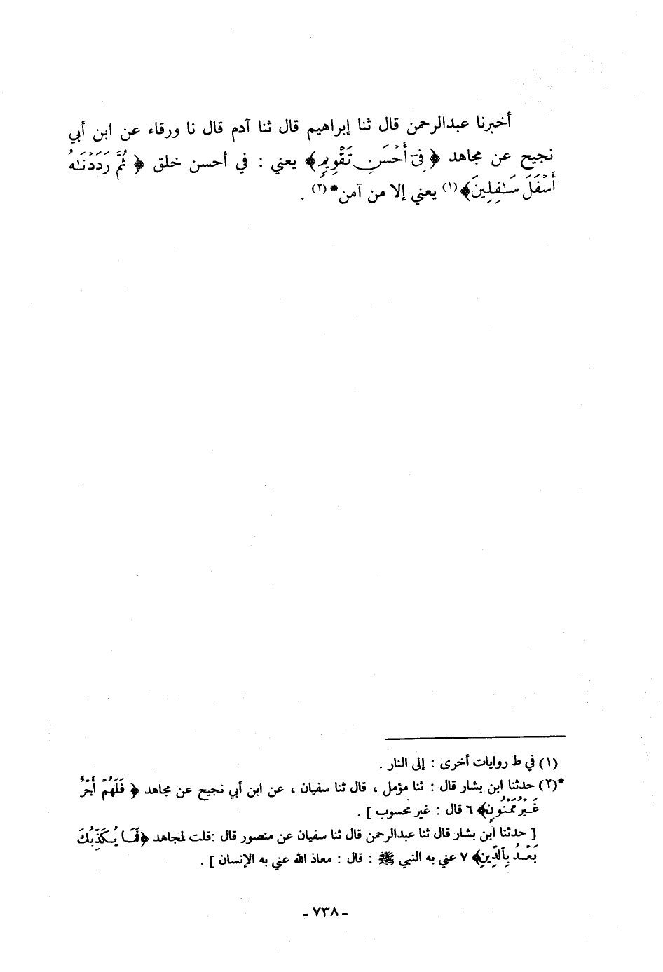 أَخْبَرَنَا عَبْدُ الرَّحْمَنِ، قَالَ: ثنا إِبْرَاهِيمُ، قَالَ: ثنا آدَمُ، قَالَ: نا وَرْقَاءُ، عَنِ ابْنِ أَبِي نَجِيحٍ، عَنْ مُجَاهِدٍ: {§فِي أَحْسَنِ تَقْوِيمٍ} [التين: 4] ، يَعْنِي: «فِي أَحْسَنِ خَلْقٍ، ثُمَّ رَدَدْنَاهُ أَسْفَلَ سَافِلِينَ يَعْنِي إِلَّا مَنْ آمَنَ»