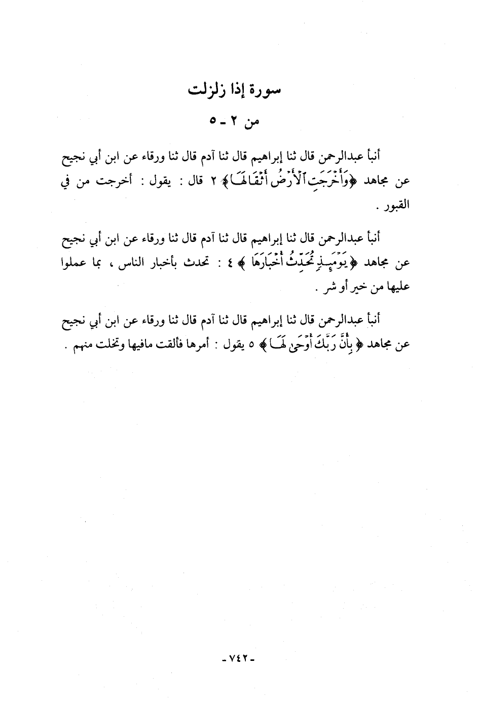 أنبأ عَبْدُ الرَّحْمَنِ، قَالَ: ثنا إِبْرَاهِيمُ، قَالَ: ثنا آدَمُ، قَالَ: ثنا وَرْقَاءُ، عَنِ ابْنِ أَبِي نَجِيحٍ، عَنْ مُجَاهِدٍ: {بِأَنَّ رَبَّكَ أَوْحَى لَهَا} [الزلزلة: 5] يَقُولُ: «§أَمَرَهَا فَأَلْقَتْ مَا فِيهَا وَتَخَلَّتْ مِنْهُمْ»